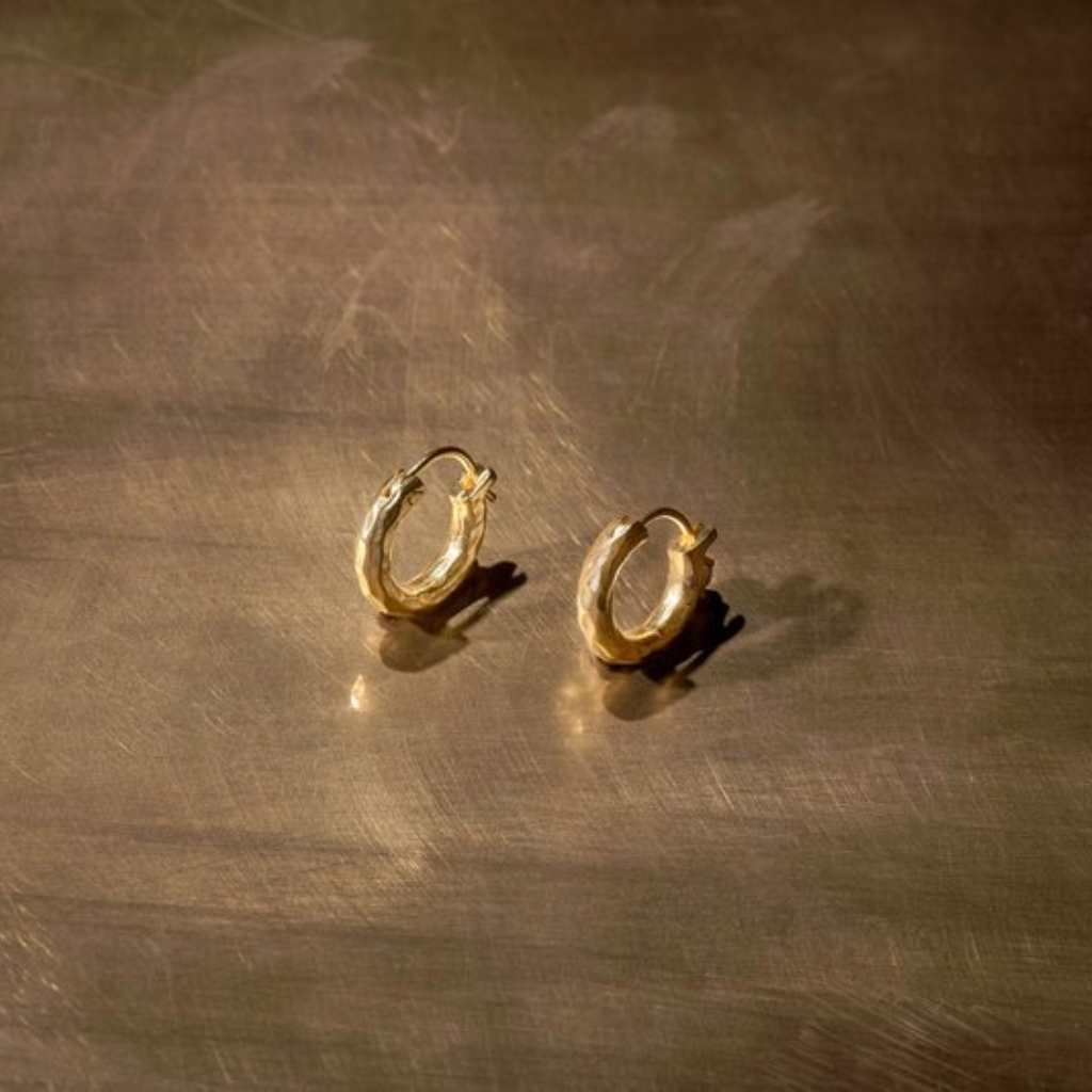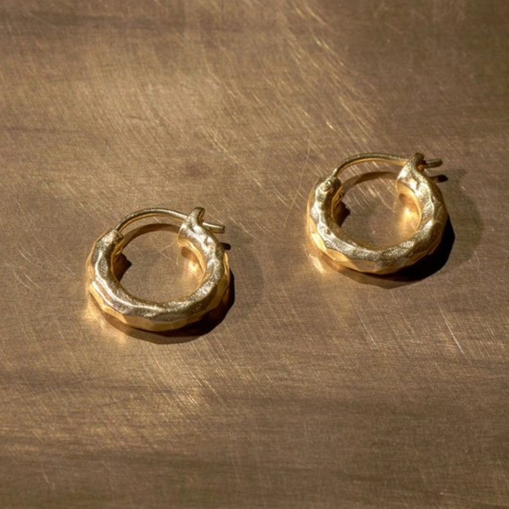 These striking Nandi hoop earrings have an elegant yet rustic design. The chunky textured hoop wraps elegantly around, perfect for adding a little bit of extra style to the everyday. These earrings are hypoallergenic and nickel-free, and plated in 22 karat gold.