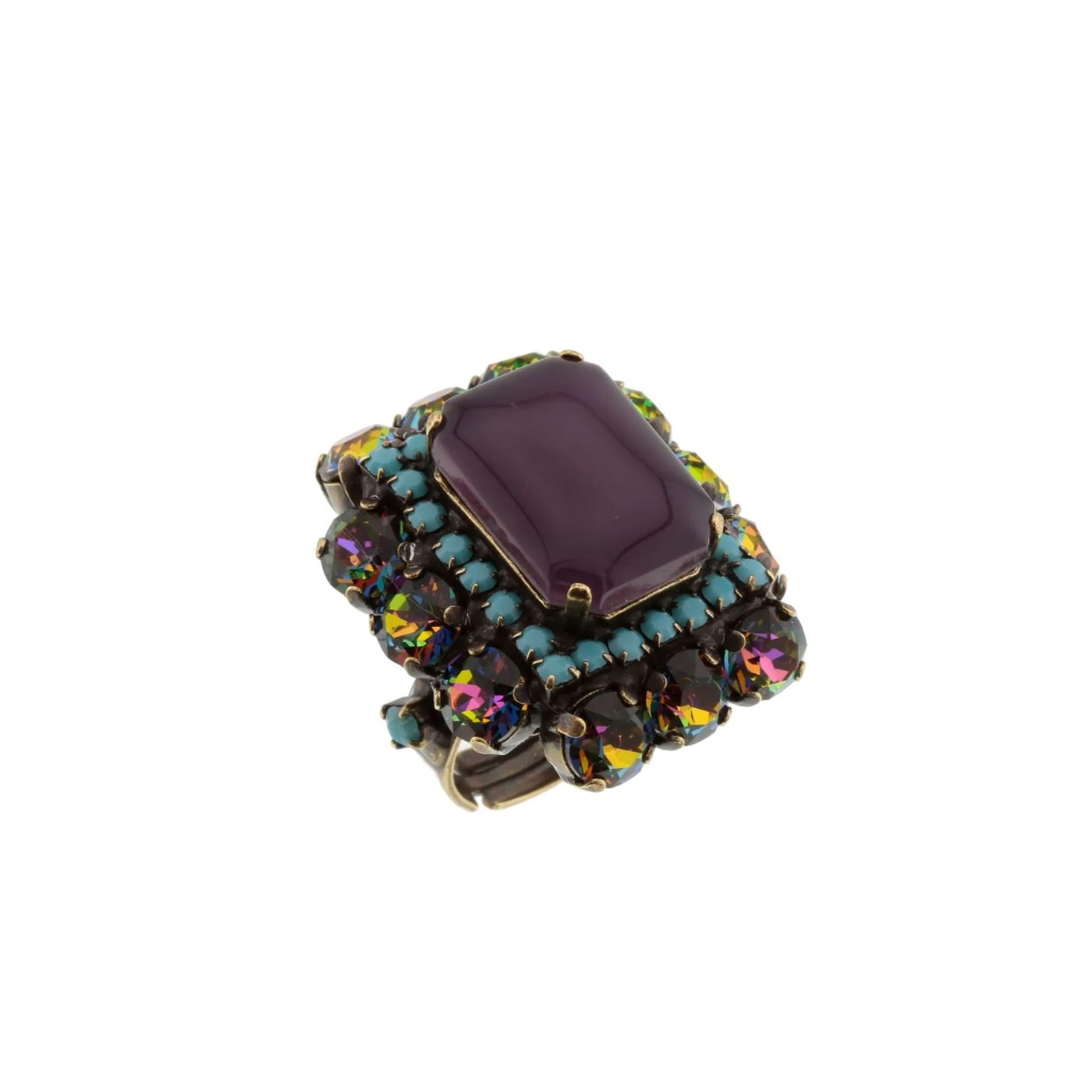 An adjustable brass statement ring featuring a sparkling glass stone with strass accents. Bold, stylish, and perfect for any occasion. Dimensions Approximately 2.5 x 3 cm