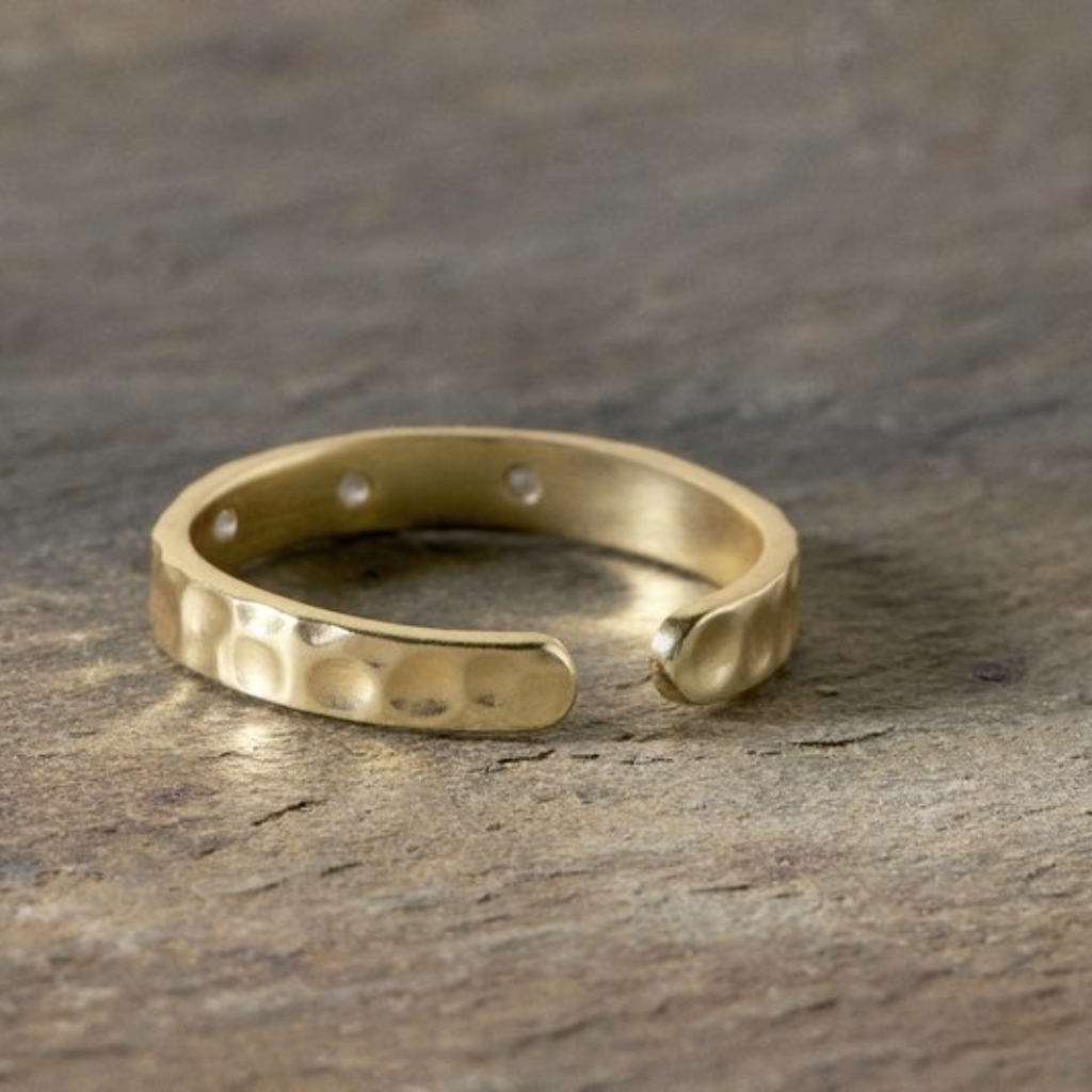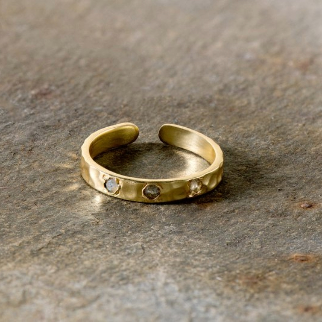 This chunky textured ring is forged from brass alloy with gold plating and three iridescent Labradorite stones set into the face to add extra shimmer to everyday occasions.