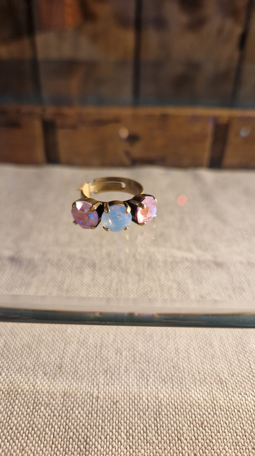A beautiful three s stone ring with swarovski crystals. Size: approx 2 cm with adjustable band.