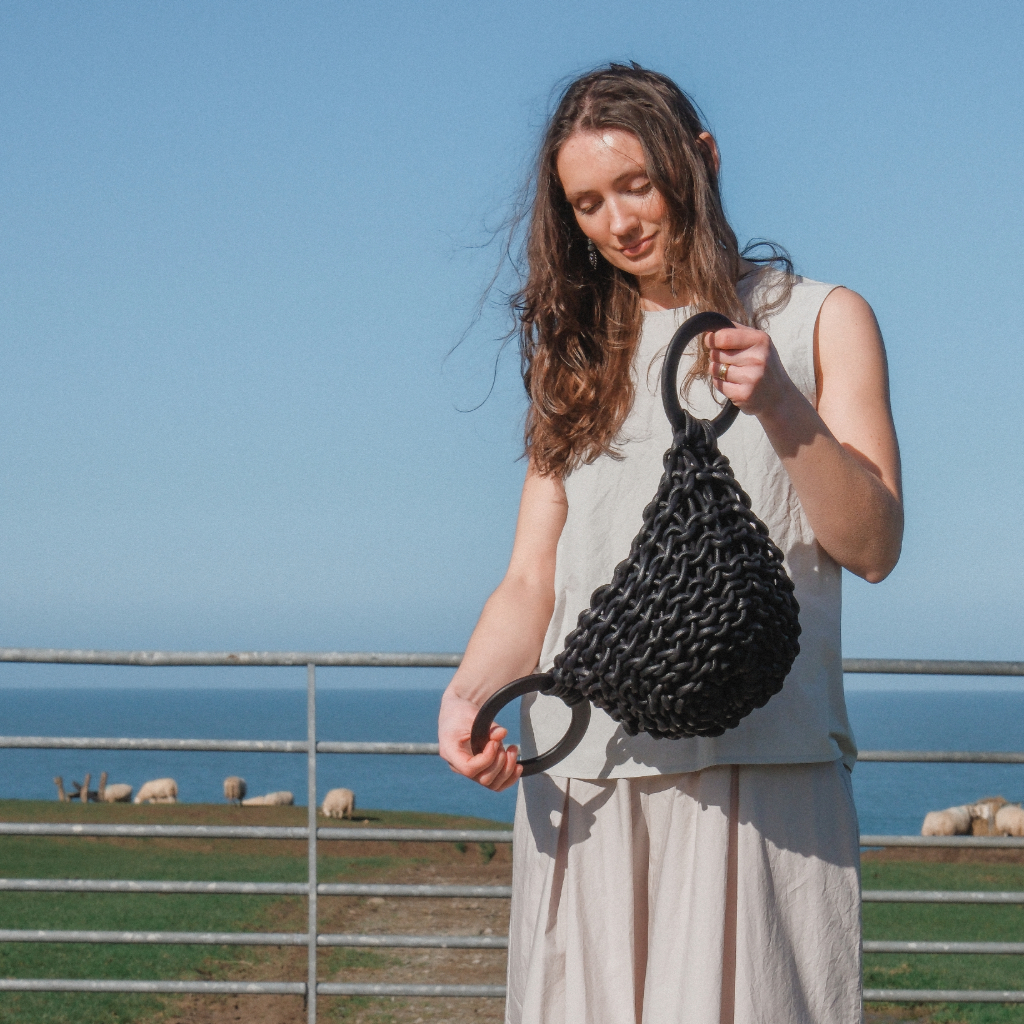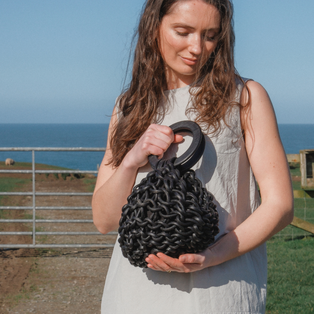 The Sofia bag is a handcrafted woven bag made from natural waxed cotton rope and finished with unique oak wood handles, each individually shaped by artisans. Designed for hand carry, it features a secure zip closure, organic cotton lining, and an internal pocket—timeless, practical, and made to last.