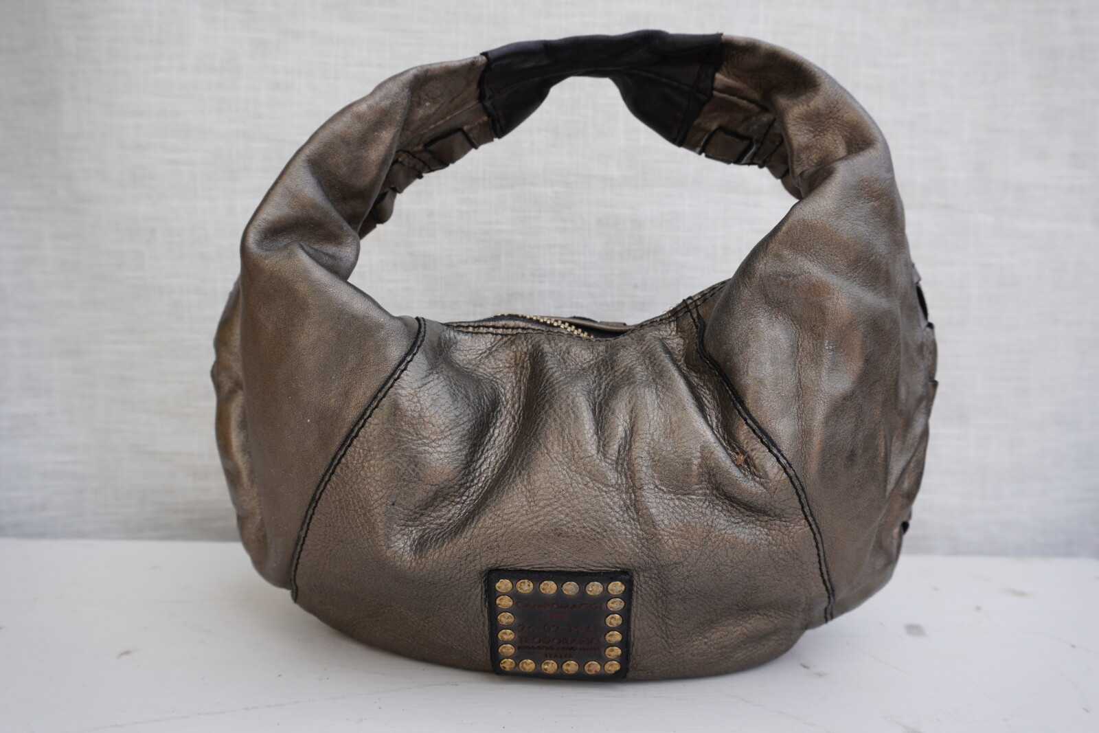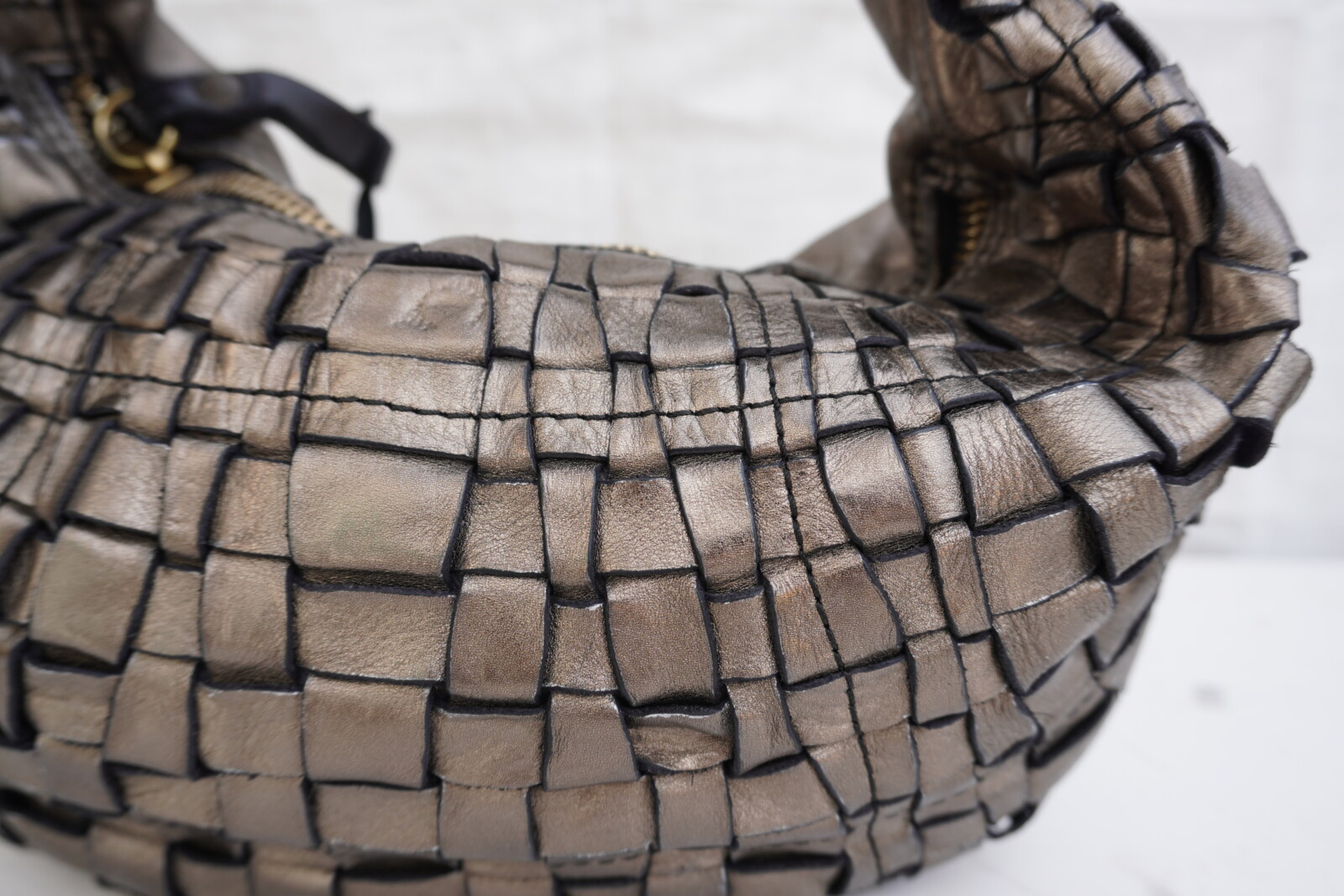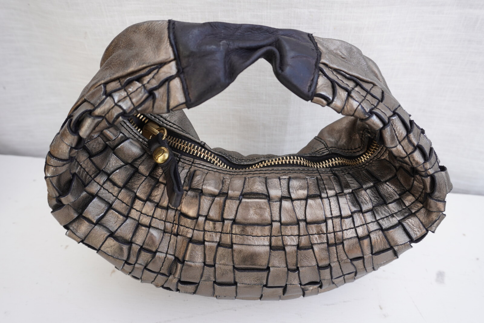 This Campomaggi woven grey leather shoulder bag exudes Italian craftsmanship and timeless elegance. Expertly crafted from premium Italian leather, its intricate woven design and rich metallic grey finish create a sophisticated yet bold statement. Made in Italy, this luxurious bag combines durability with style, making it the perfect accessory.