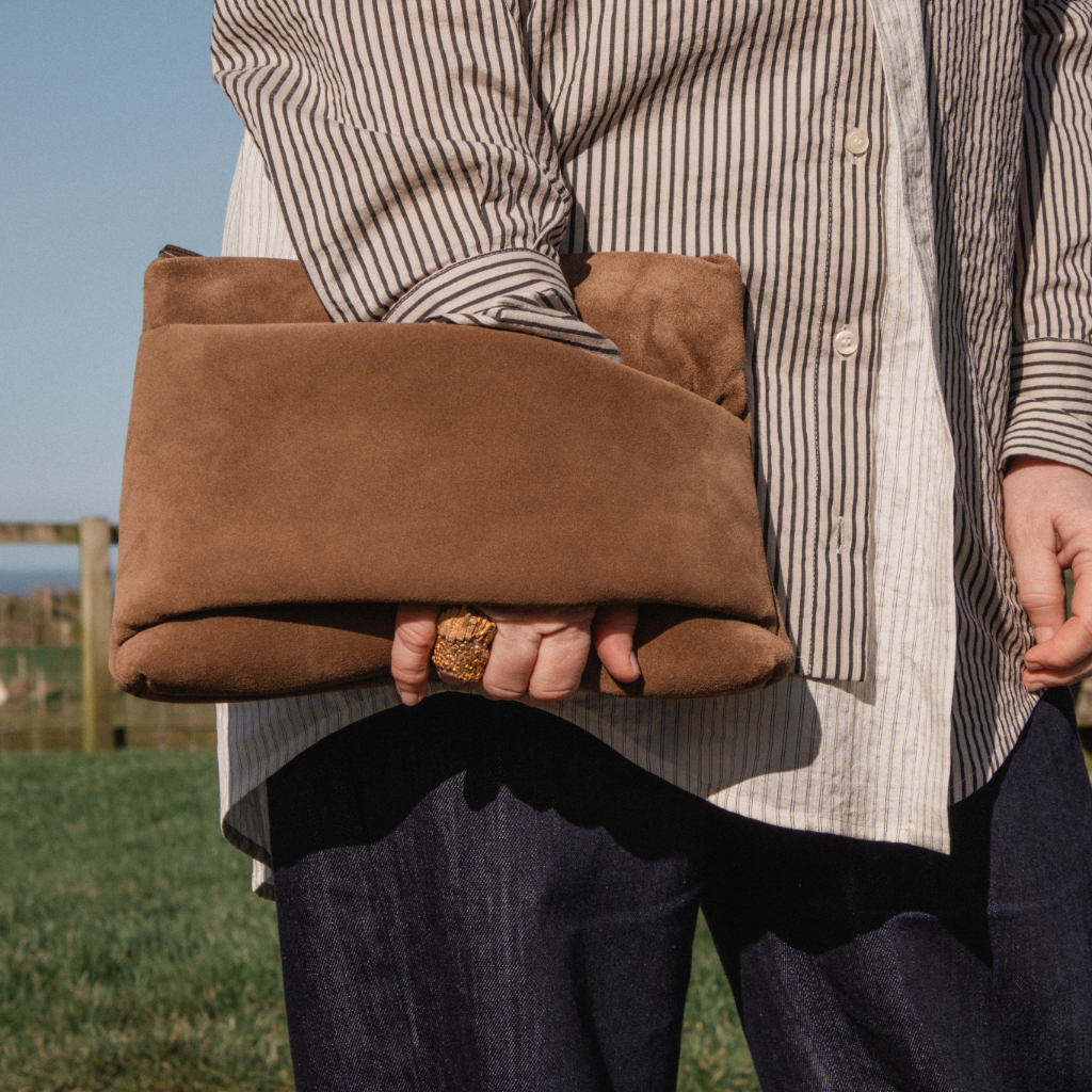 Ernesto Dolani bag in antelope-coloured suede. Featuring zipped and padded front detailing, allowing it to be worn as a clutch. Removable strap. Lime green interior with one zipped compartment and one internal pocket.