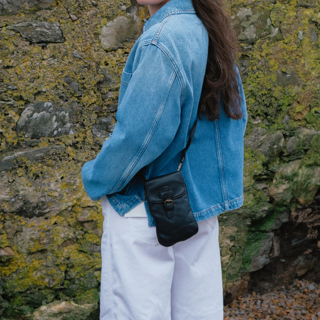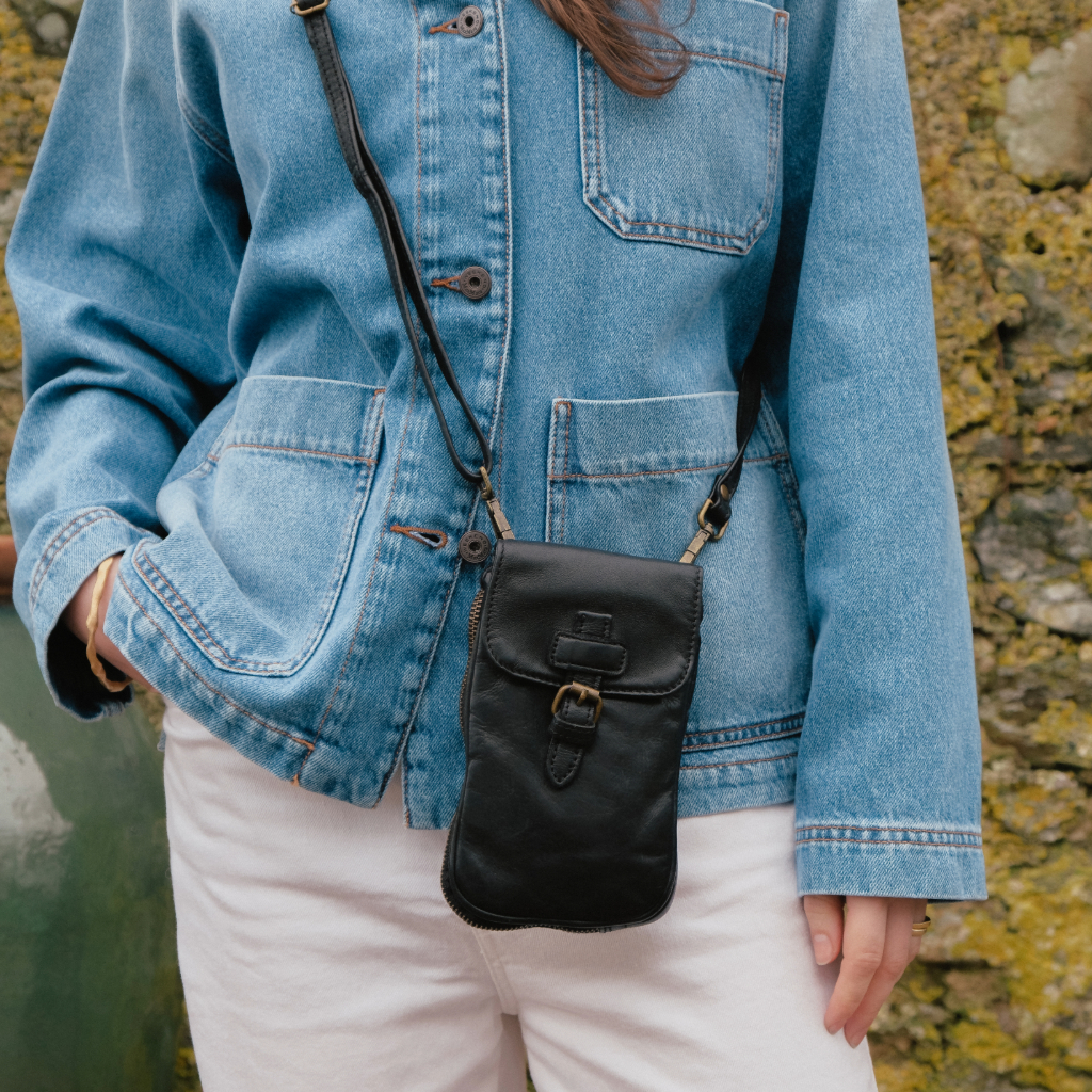 Compact crossbody leather pouch designed for everyday essentials. Features a front phone pocket, zip-around wallet at the back, and a concealed stud fastening. Removable strap and cotton twill lining.
