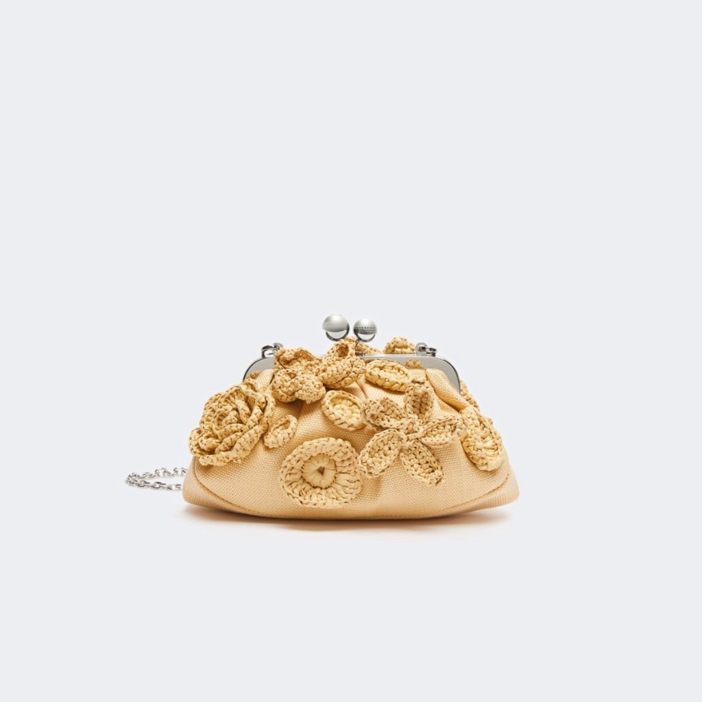 The small Pasticcino bag from Weekend Max Mara is a statement clutch crafted in raffia-effect woven fabric, embellished with delicate 3D floral appliqués. Finished with a striped lining, signature sphere clasp, and a removable chain strap with leather shoulder pad, it adds a playful yet refined touch to everyday looks.