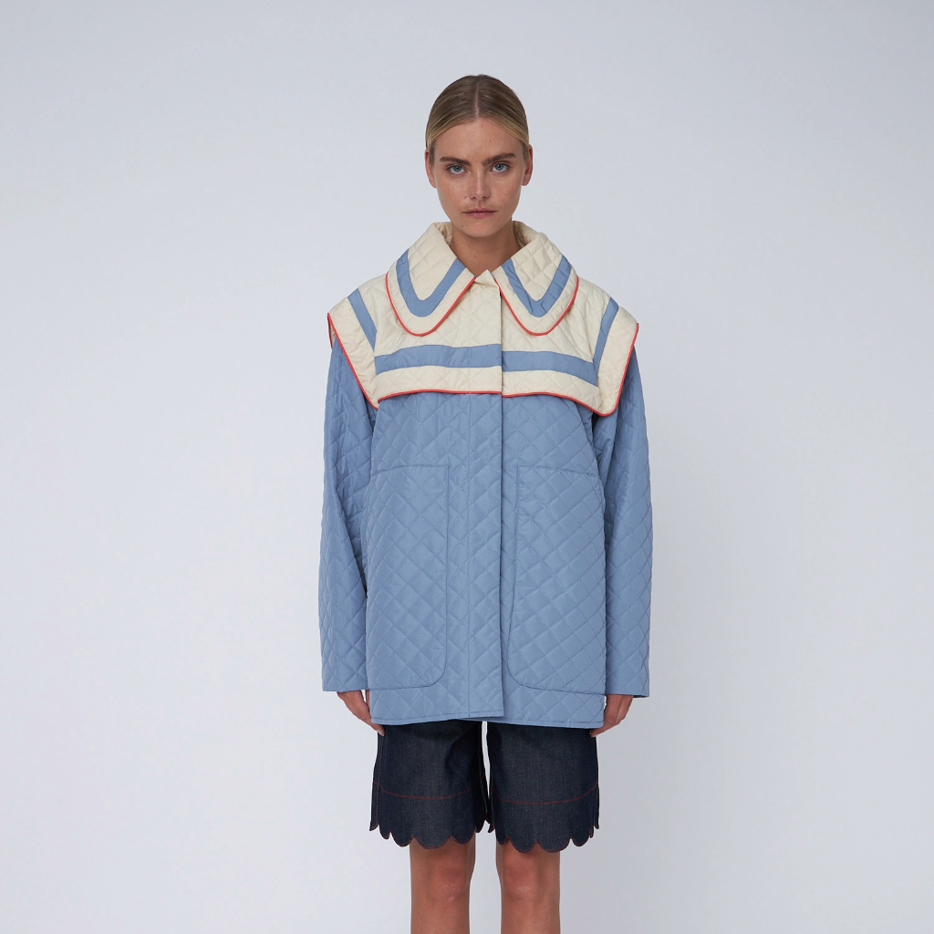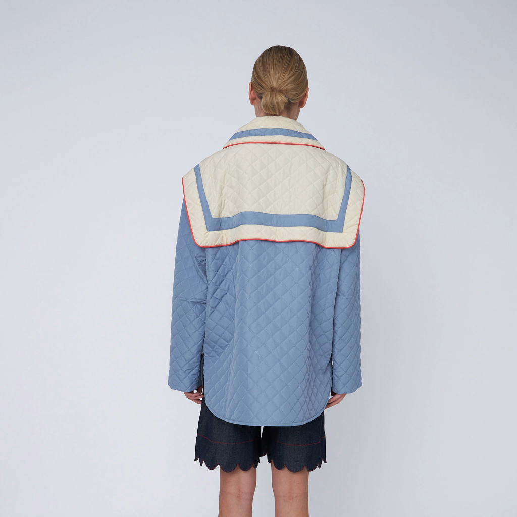 Oversized quilted jacket with a large collar, inspired by the sailor’s uniform. Front closure with hidden buttons and made with large patch pockets.