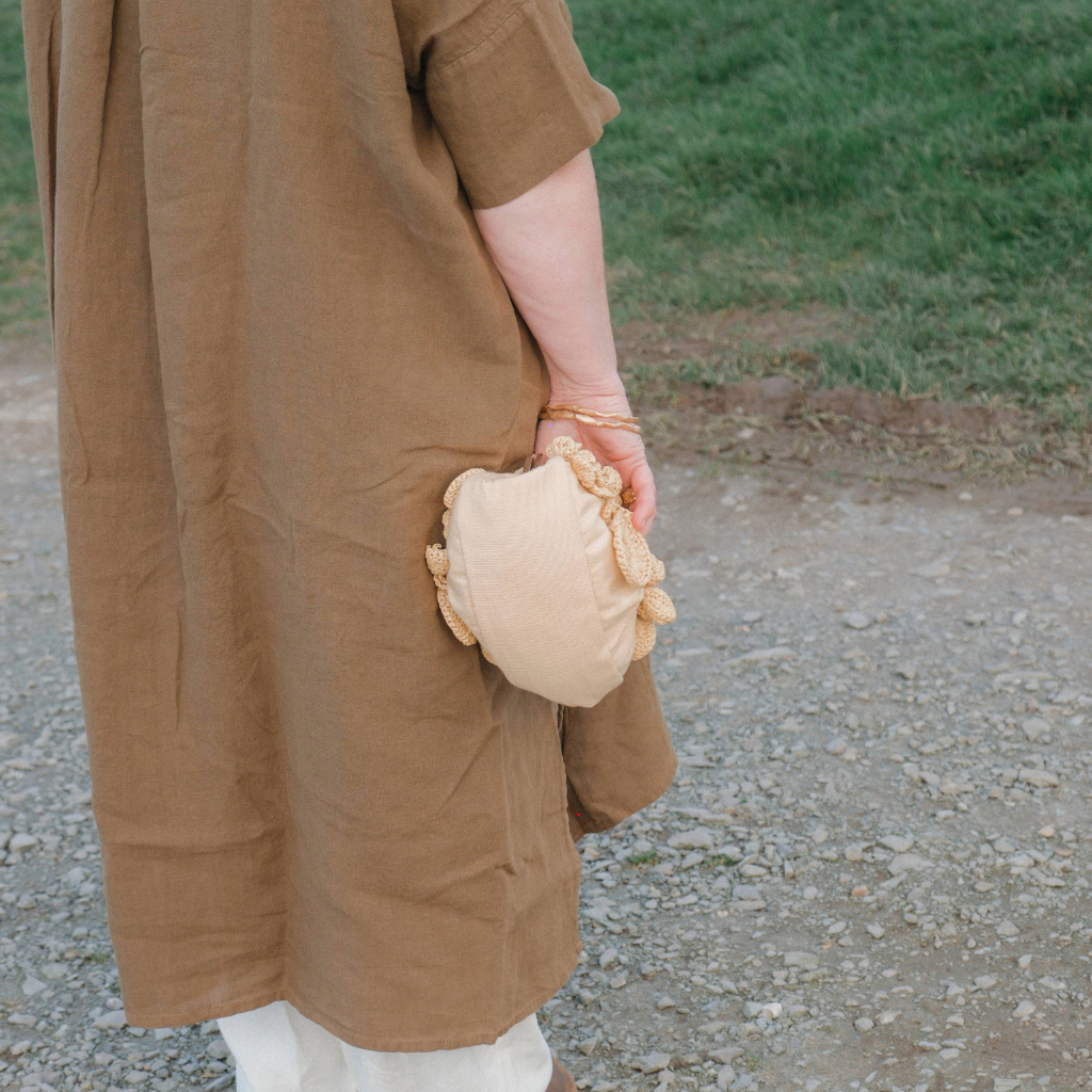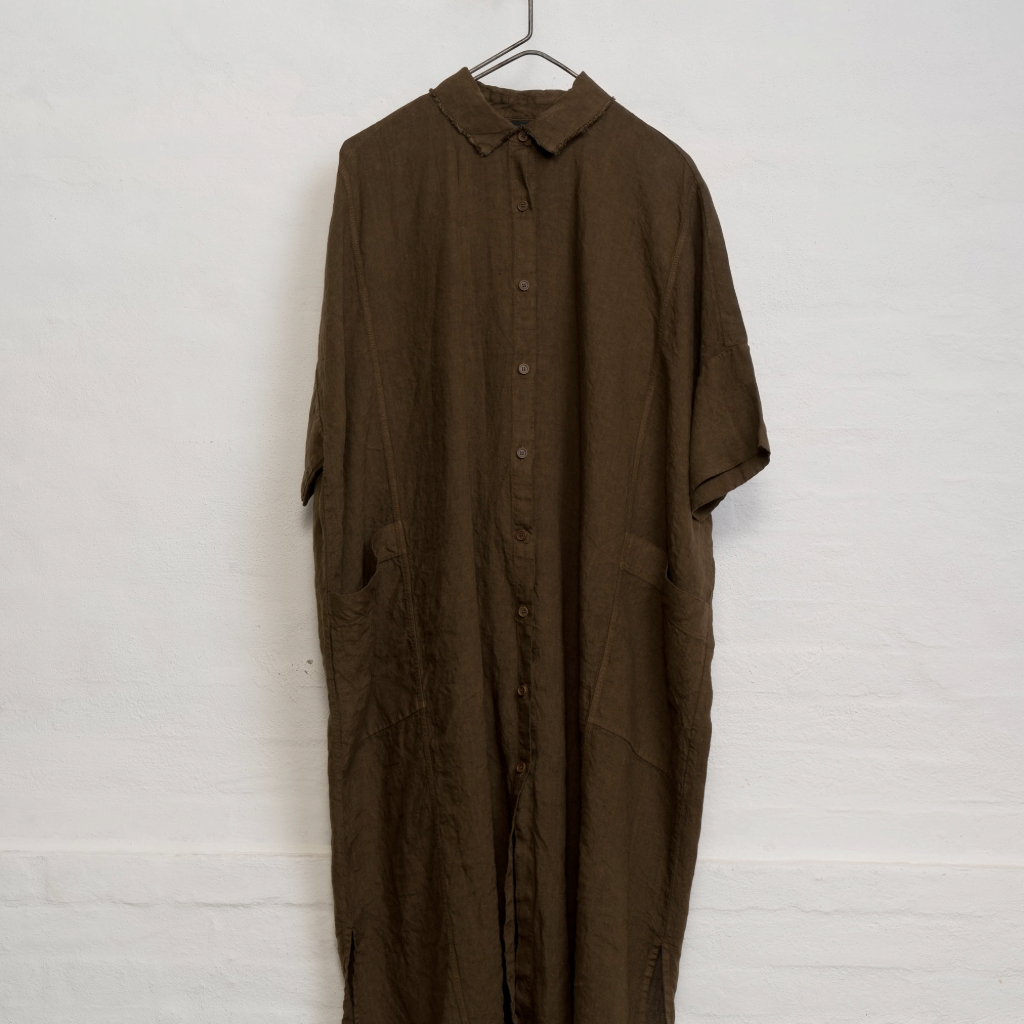 The Aequamente linen shirt dress in tobacco features short sleeves, a narrow collar, a button front, and two side pockets for a simple, timeless look.