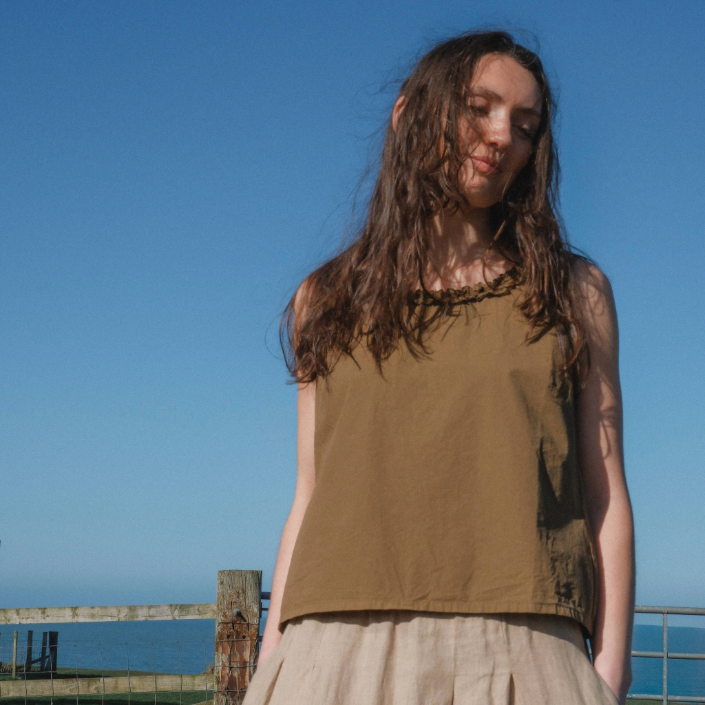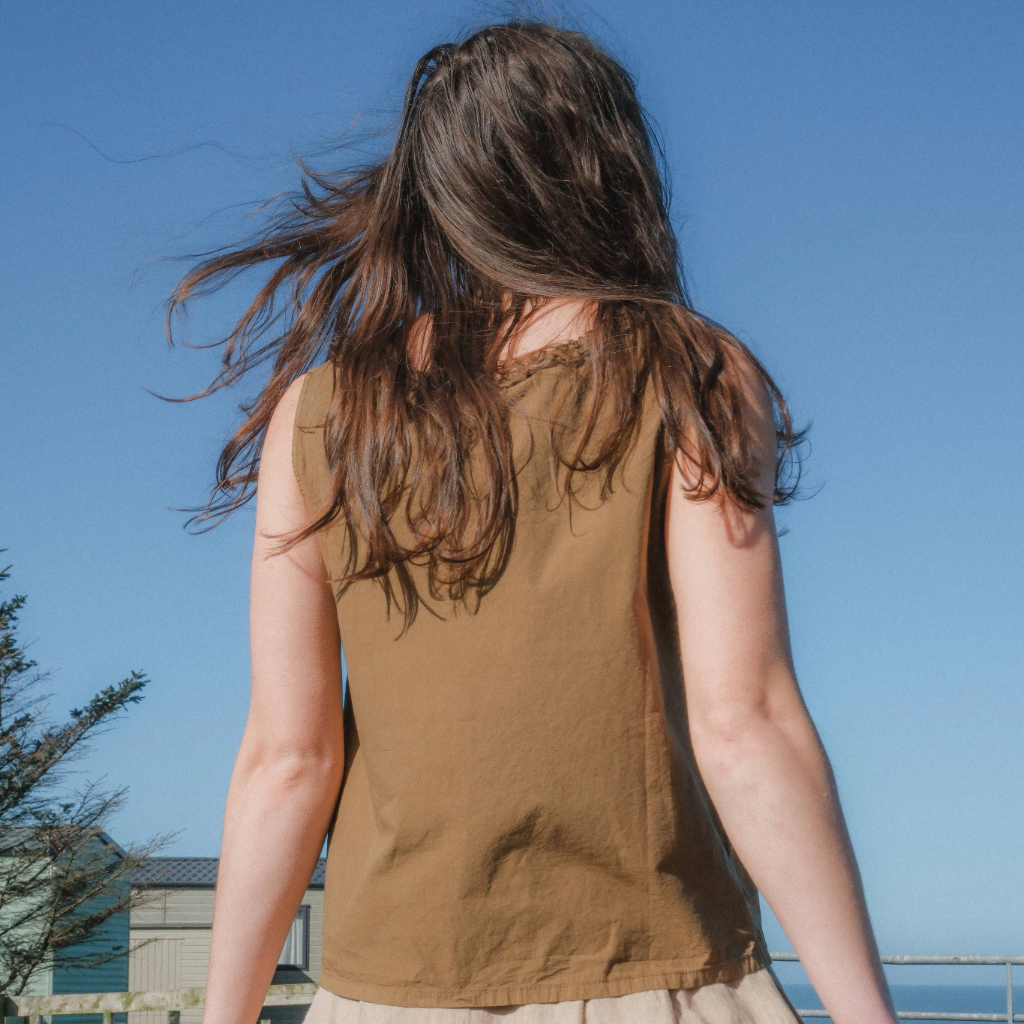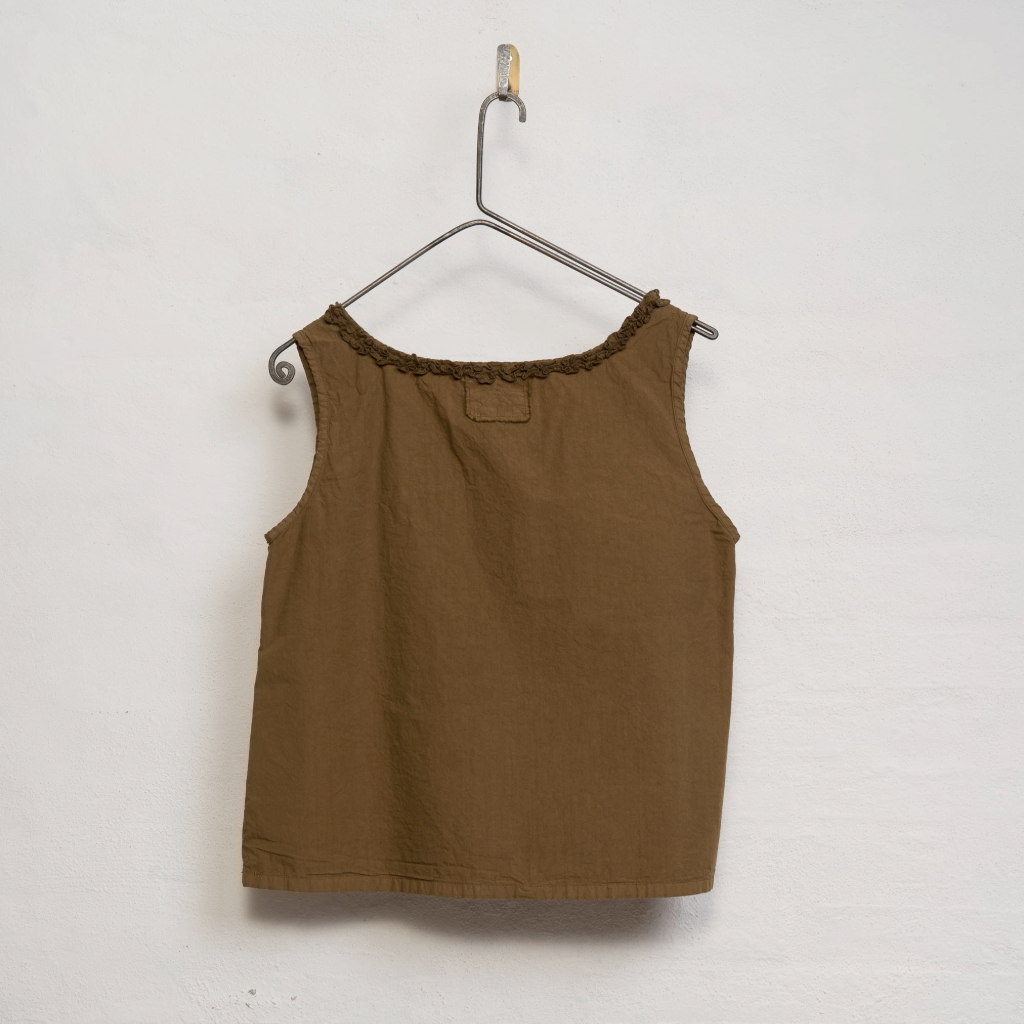 The Aequamente Sleeveless top is made from cotton in a tobacco shade. It features a round neckline with subtle ruffle detailing for a simple, clean look.