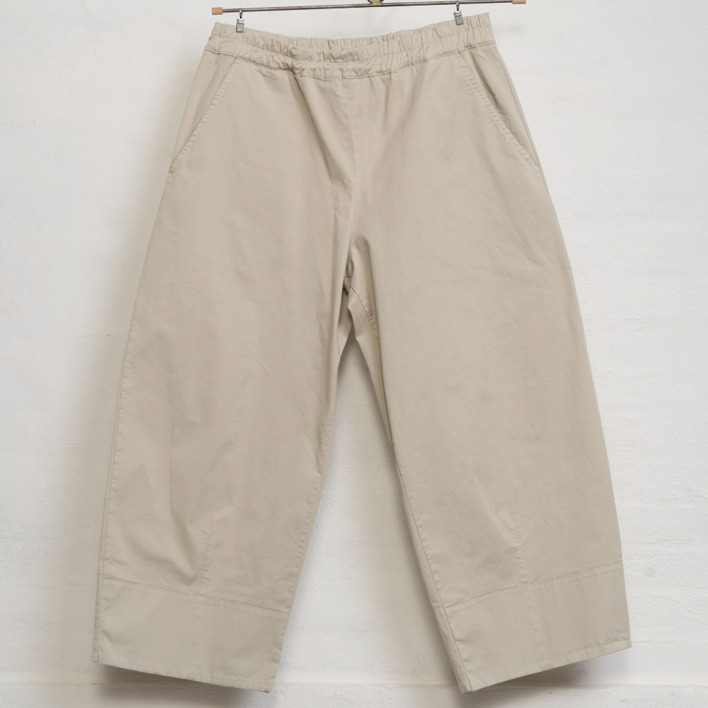 The Aequamente trousers in sand feature a classic shape with a slight barrel leg and wide hem. They have an elasticated waist and two pockets — a favourite that returns season after season.