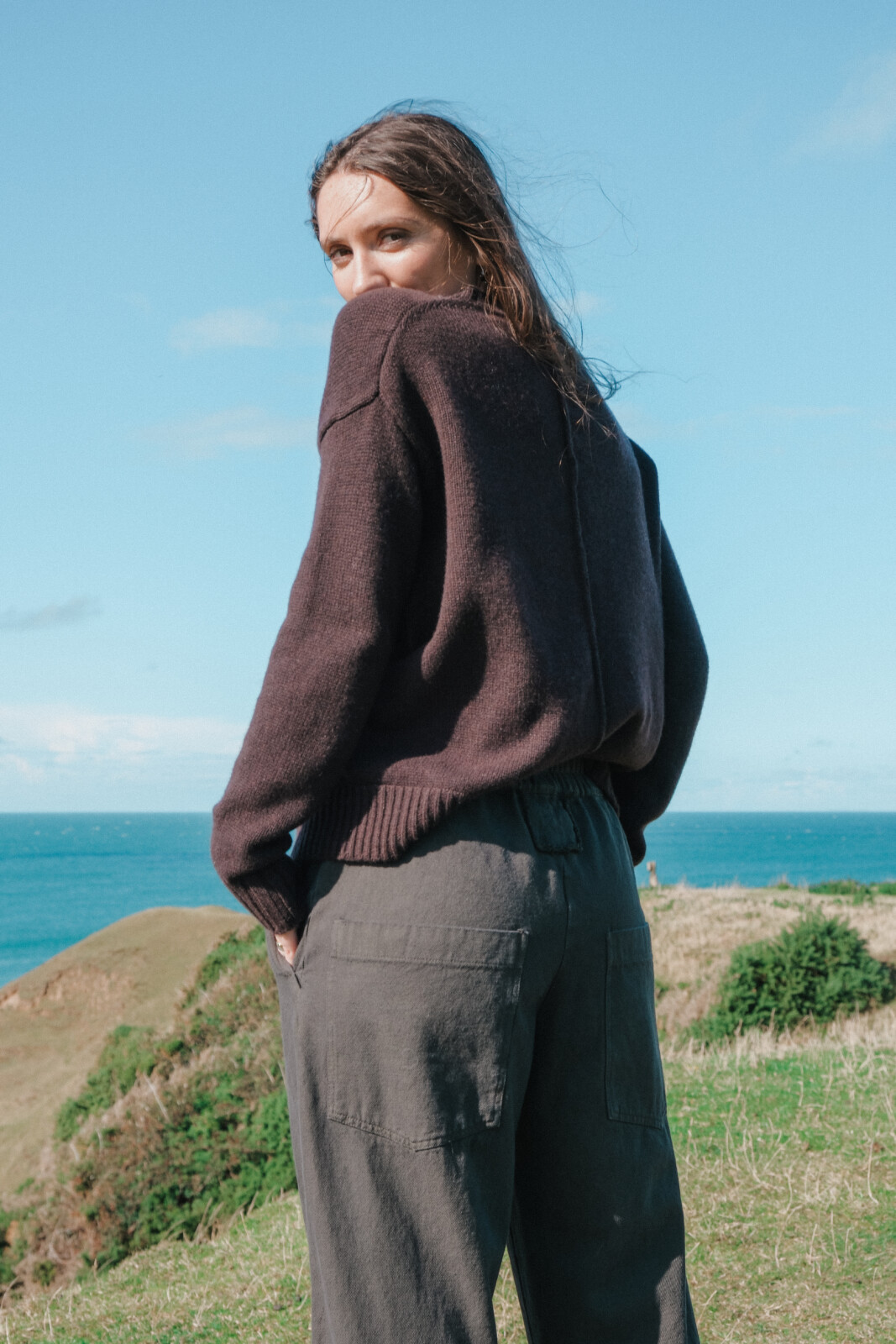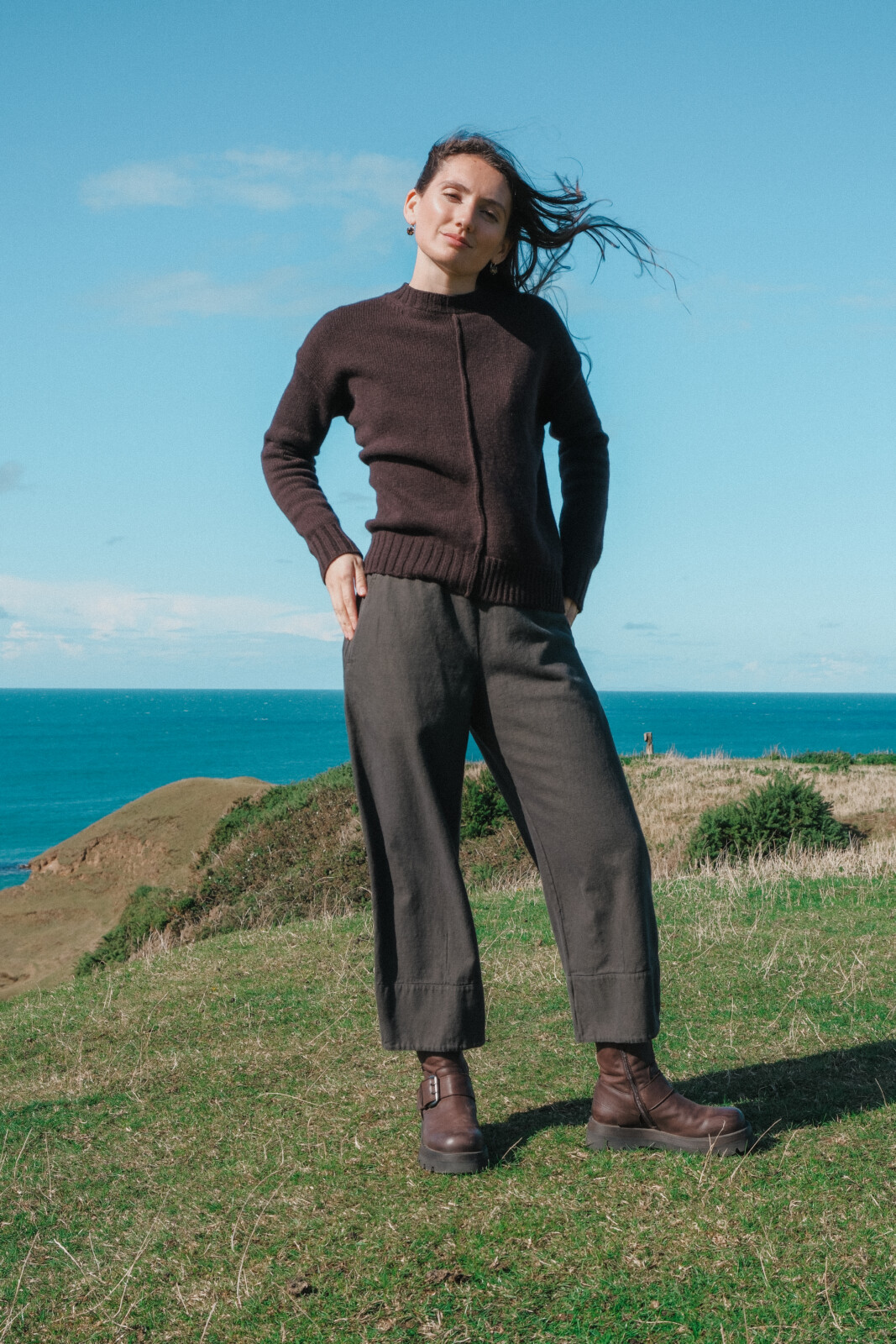 Aequamente trousers in textured cotton drill, cut with a wide, slightly shaped leg that flatters most body types. Ankle-length with a wide seamed hem, elasticated waist, slanted side pockets, and back patch pockets. Easy to style with shirts, knits, or jackets, they offer both comfort and versatility. True to size, or size up for a looser, longer fit.