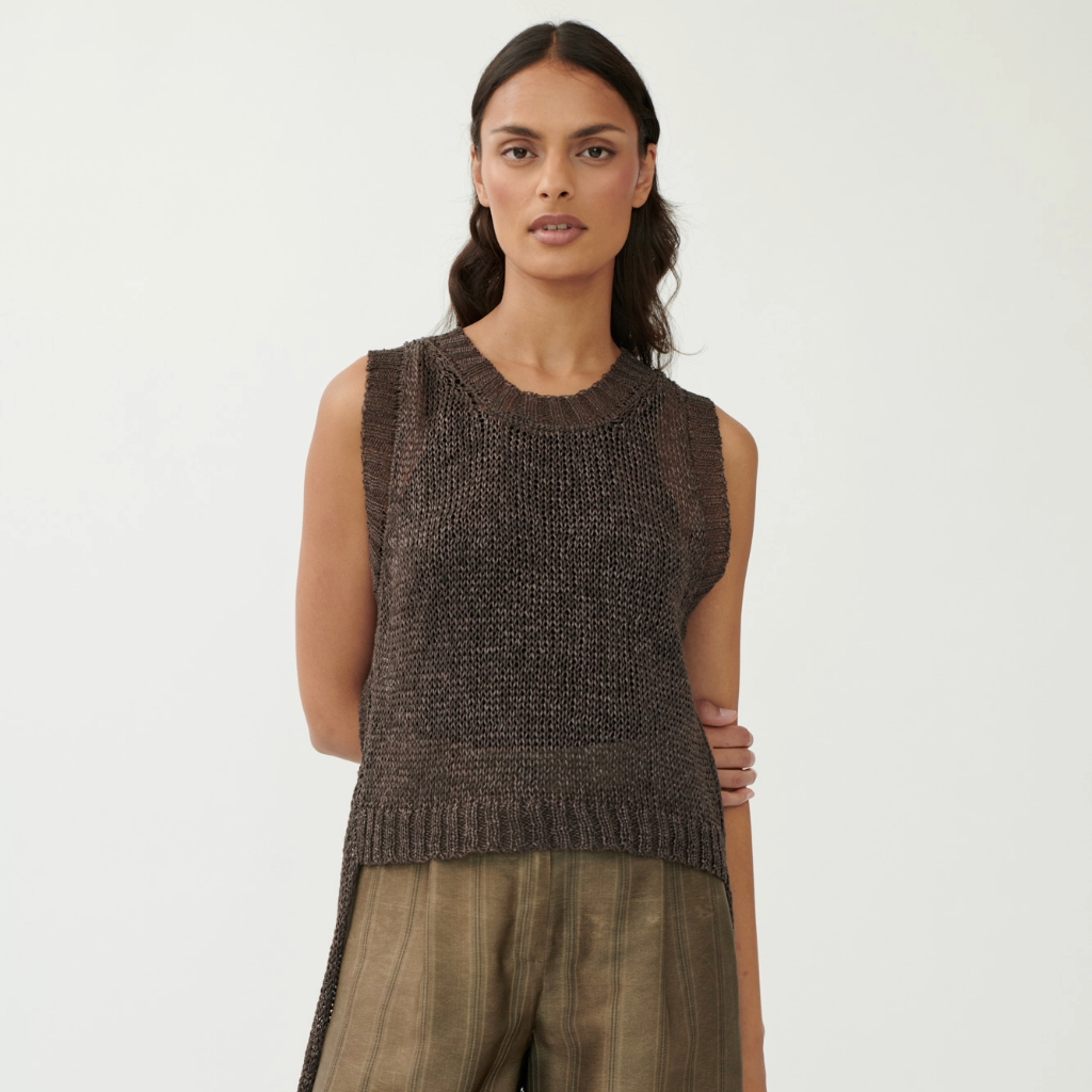 The Annette Görtz Alba knit top is a relaxed, sleeveless knit with a short front and elongated back panel featuring a contrasting thread. Loosely knitted from a lightweight viscose, linen, and cotton blend, it’s perfect for warmer days. Finished with a round neckline, wide ribbed edges, and side slits for a modern, airy silhouette.