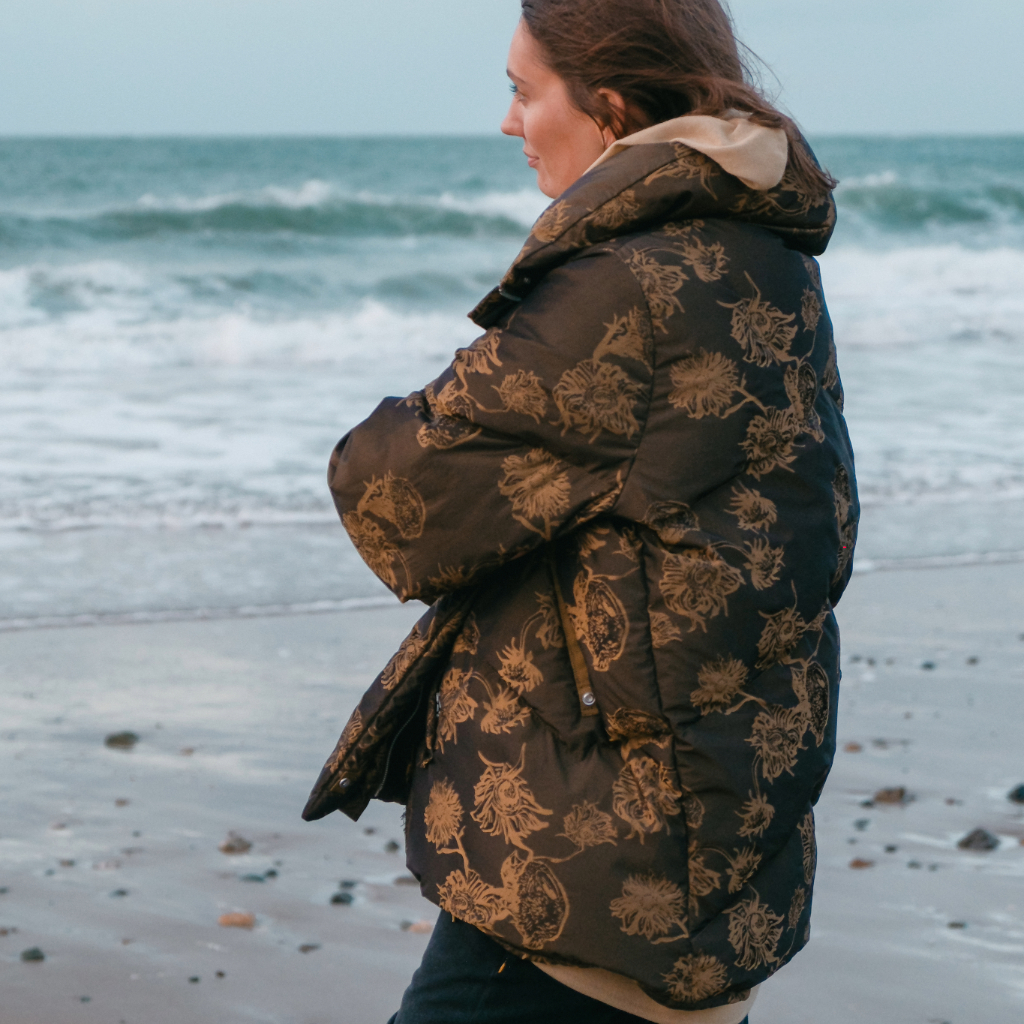 A light, voluminous down jacket in iridescent floral jacquard nylon. Designed with a generous stand-up collar, side zip pockets, snap buttons, and grosgrain ribbon details. Features elasticated inner sleeve hems, reinforced raw-edge seams, and a drawcord hem. Can also be worn “upside-down” for a versatile look.