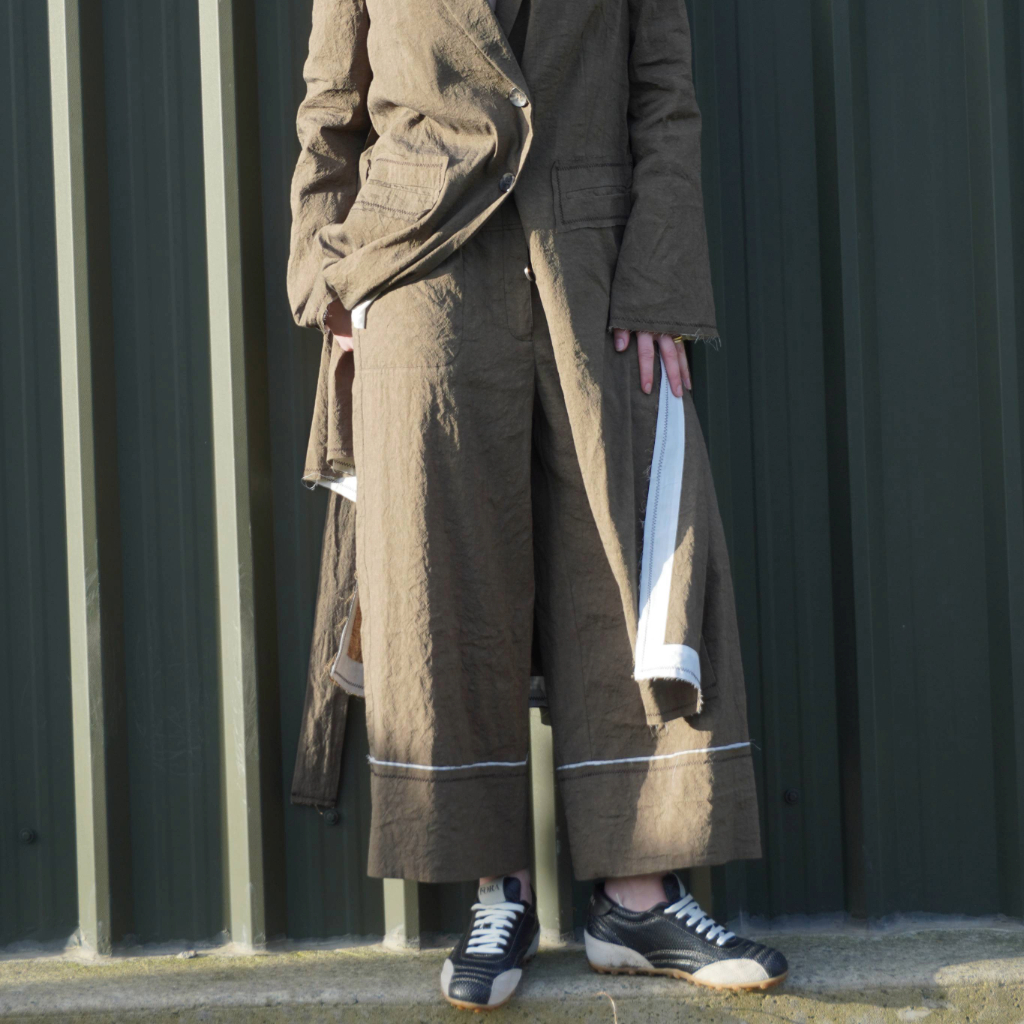 The Annette Görtz Bravo trousers are crafted from a cotton-linen blend with a washed, textured finish. Designed in a wide-leg silhouette, they feature a fixed front with an elasticated rear waistband, button and zip fastening, and front pockets. Finished with a raw edge hem and contrasting trim. Made in Poland.