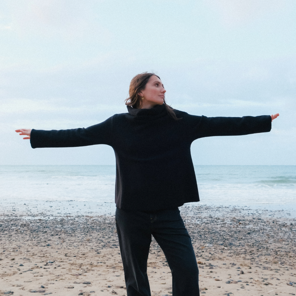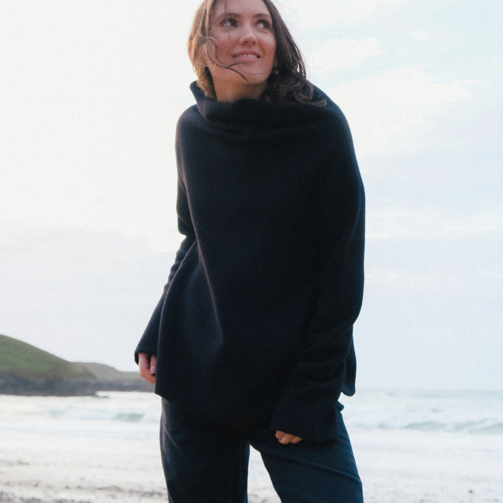 A casual-elegant pullover in soft felted merino wool, featuring a boxy straight cut, straight sleeves, and a relaxed stand-up collar for effortless comfort and style.