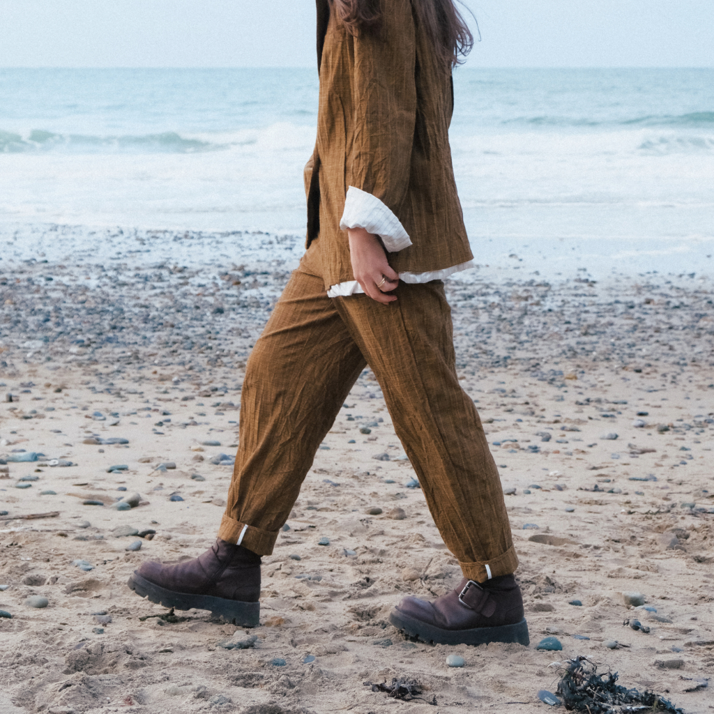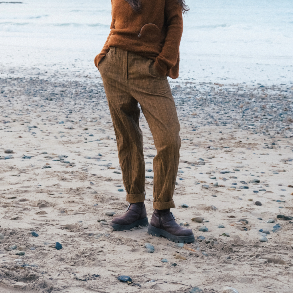 Relaxed, textured trousers with a modern tapered leg and adjustable cuff detail. Easy to wear, effortlessly stylish, and perfect for everyday layering.