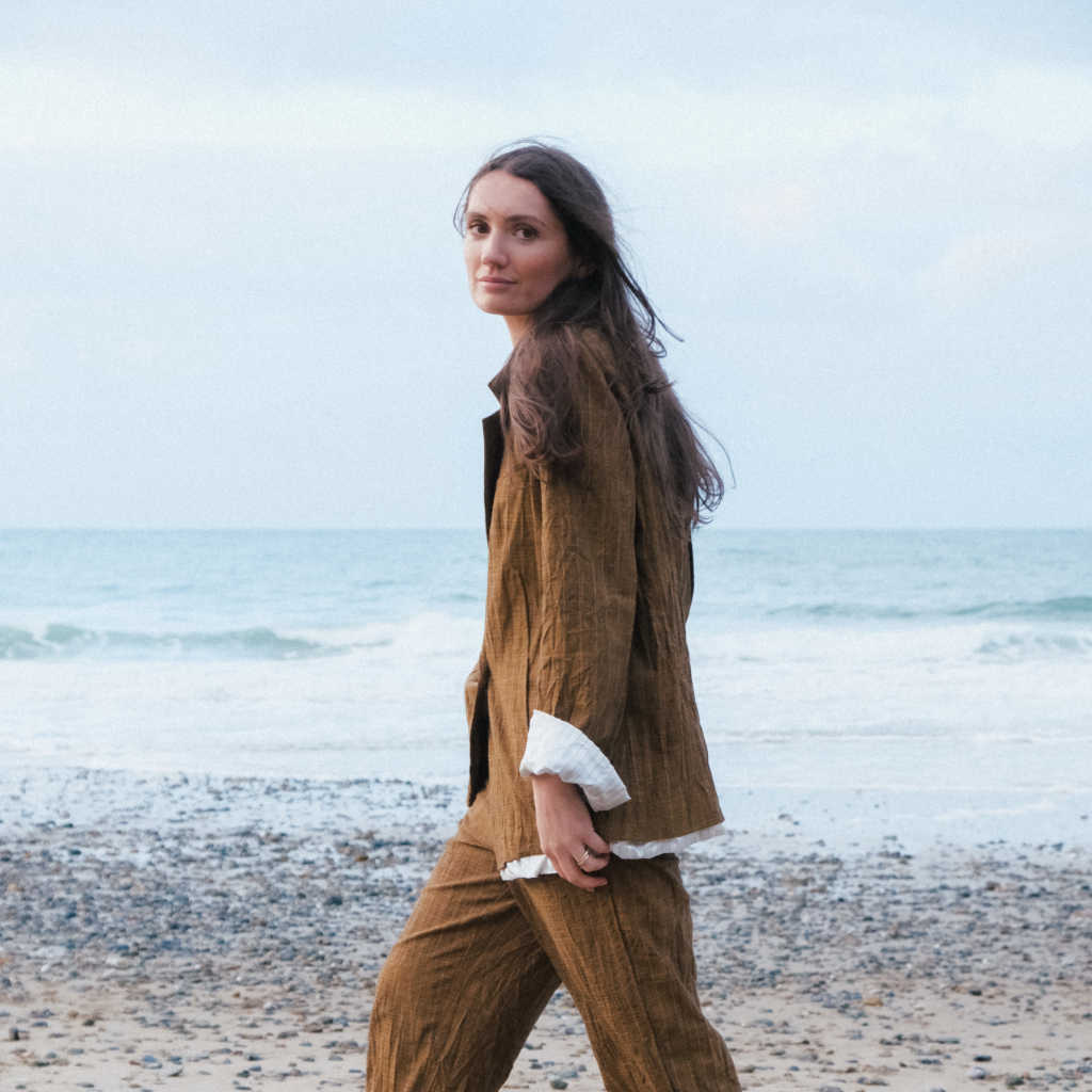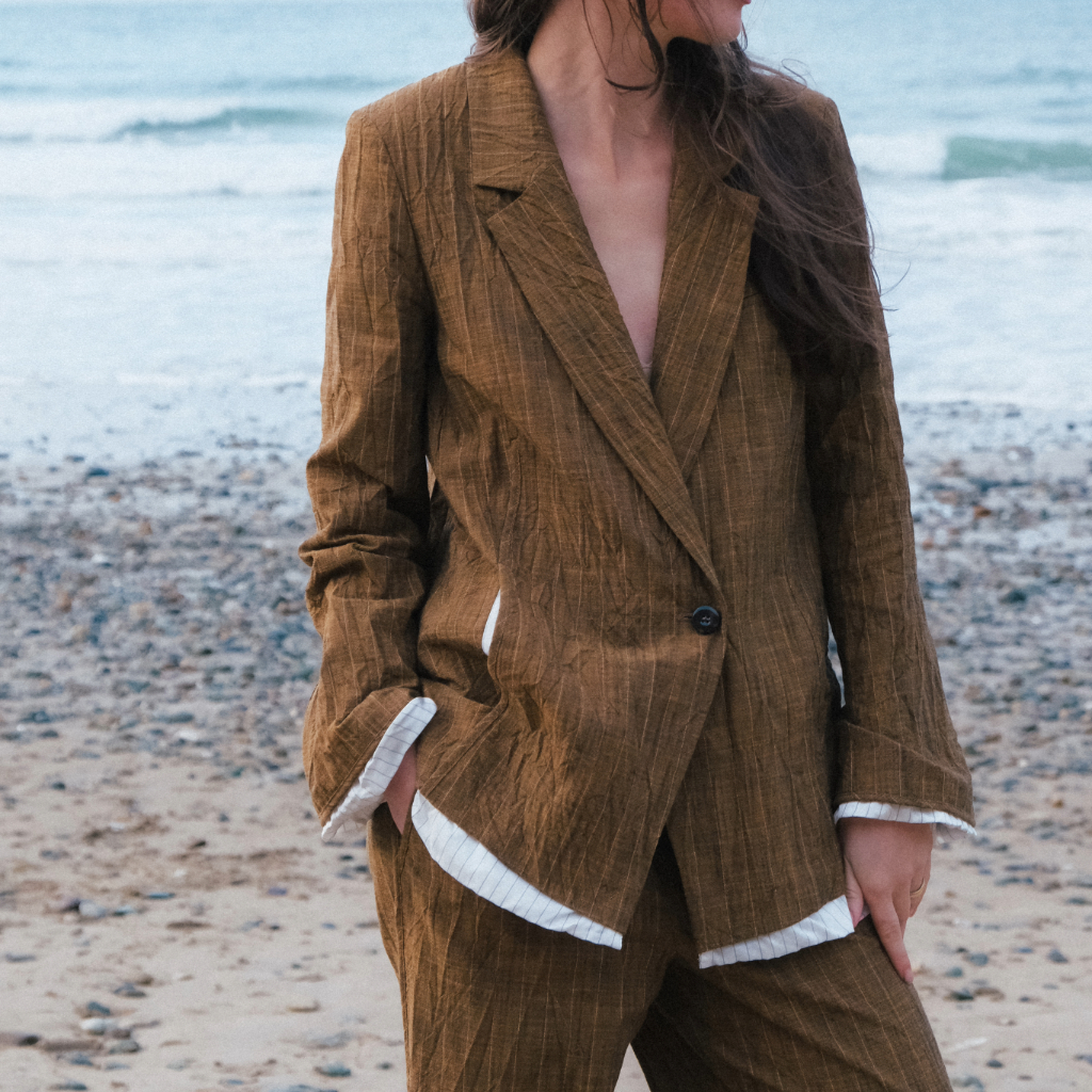 A relaxed, oversized blazer with structured shoulders, crafted from a cotton-wool pinstripe fabric with a soft crinkled finish. Designed with a notch lapel, welt and jet pockets, and flared sleeves. The striped lining features extra length for a subtle balloon effect, adding a modern twist to a classic piece.