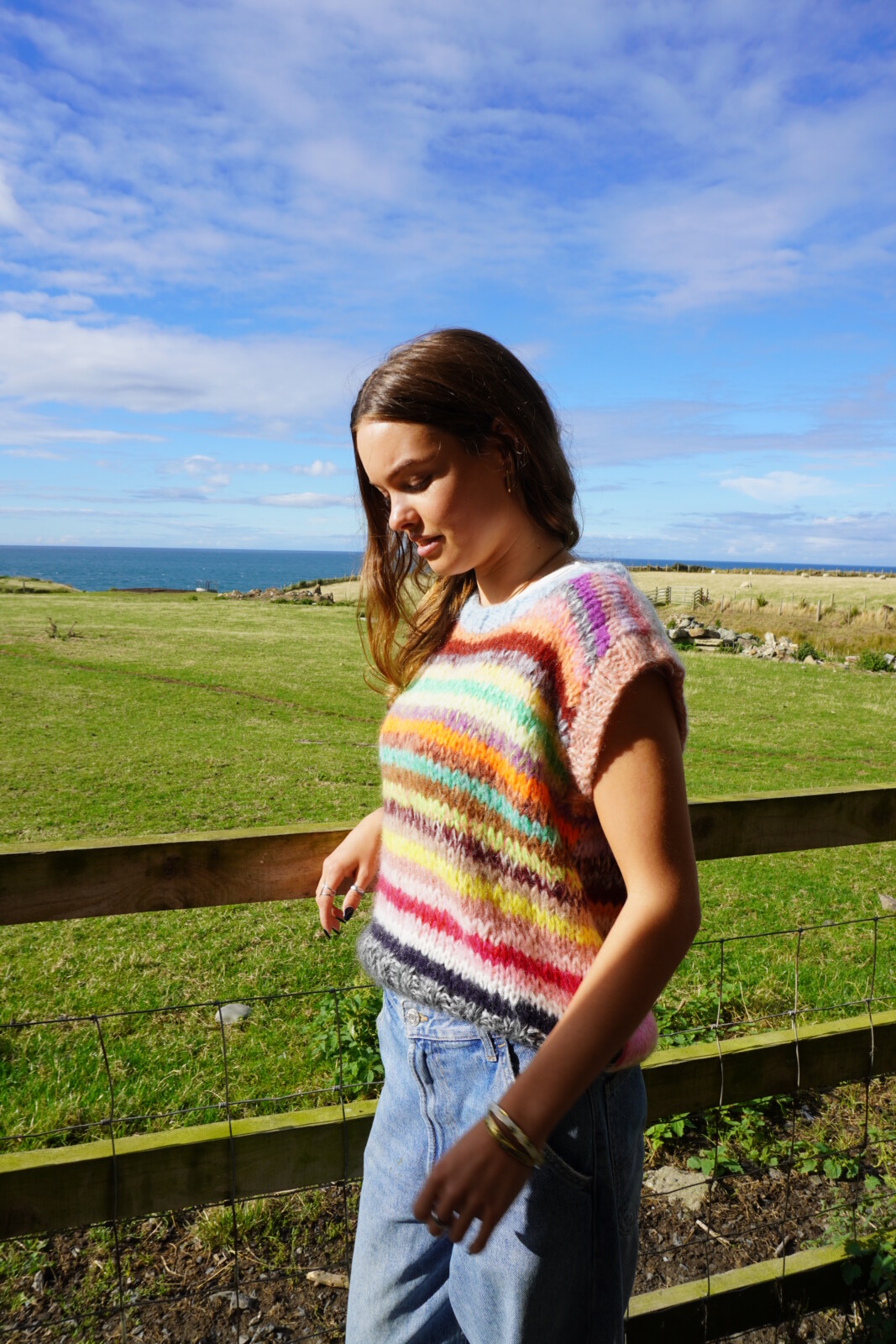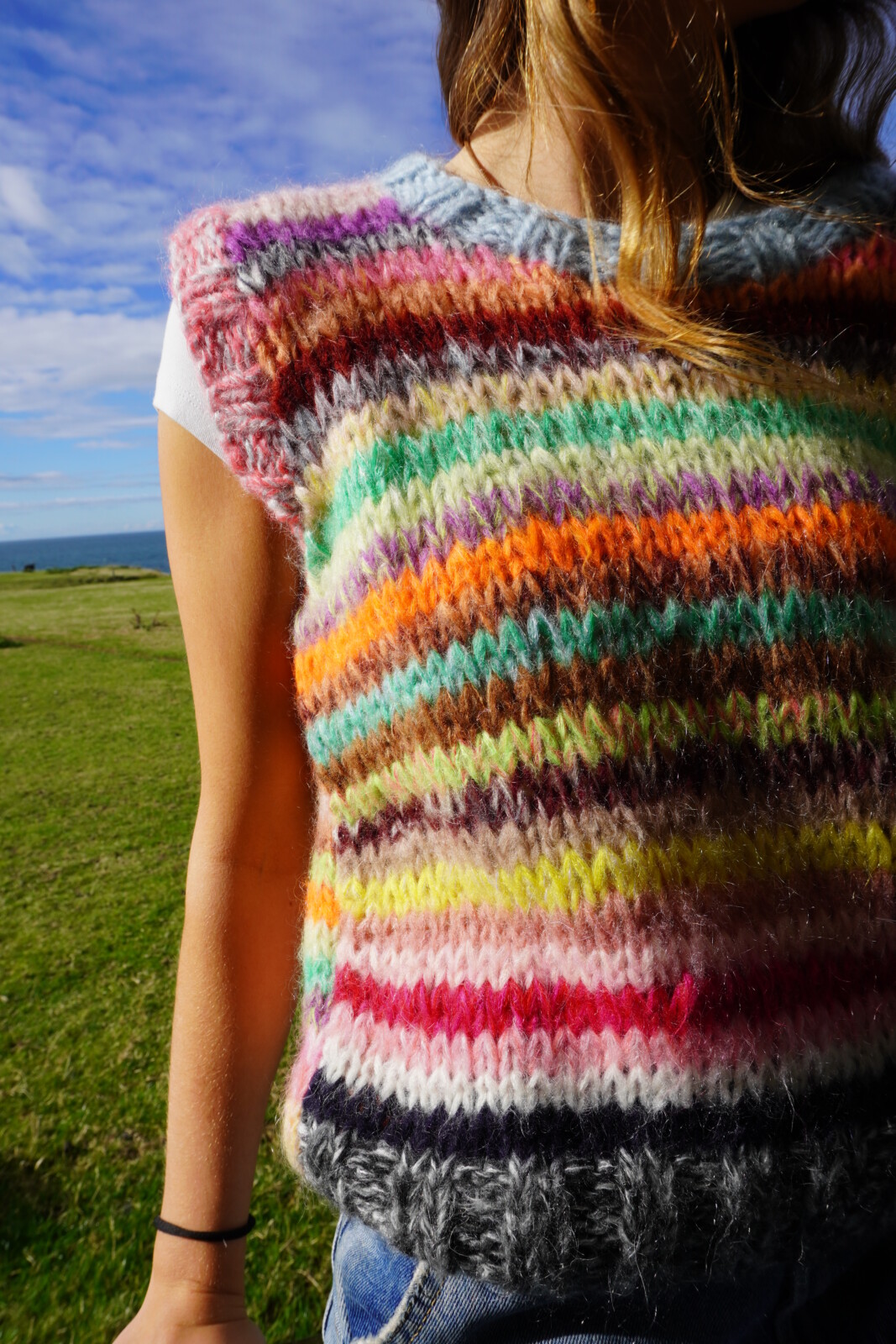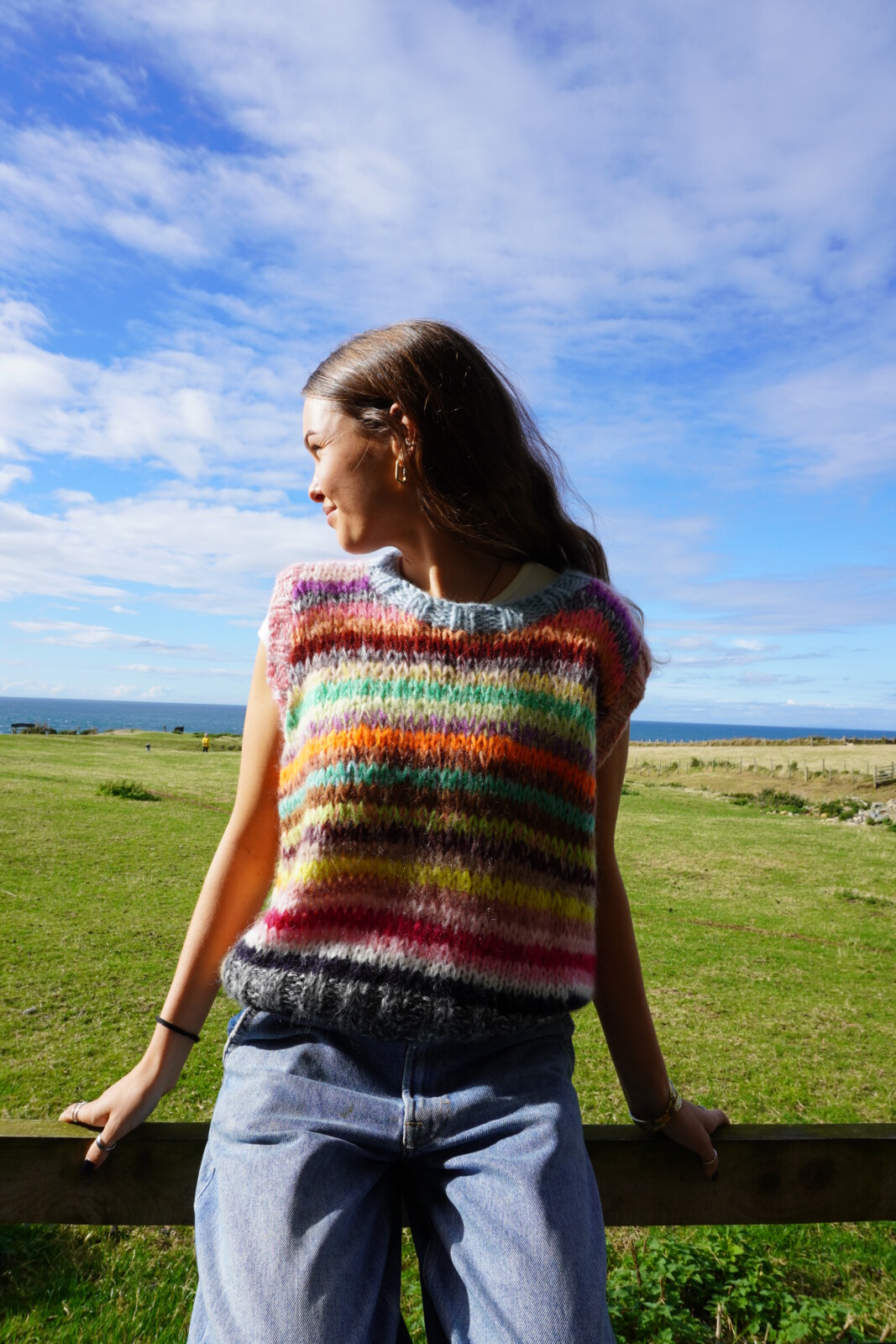 The Cooper Vest is a multicoloured mohair knit with a sleeveless design and relaxed fit. Made from leftover yarn, each vest is unique in its colour combination and hand-numbered. Crafted by skilled artisans in Italy, it takes 2–3 days to create, making it a sustainable and one-of-a-kind piece.
