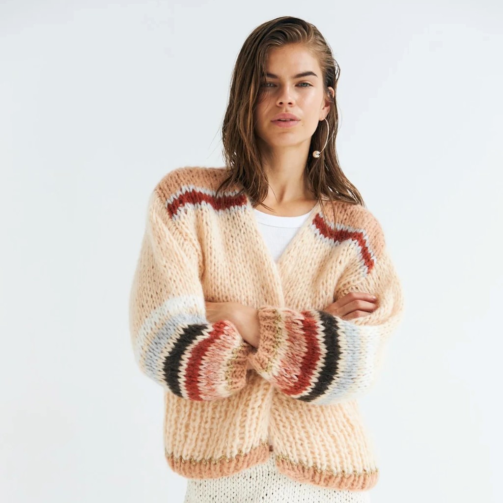 Eden is a hand-knitted cardigan with a relaxed fit and soft striped detailing in warm seasonal tones. Designed with voluminous sleeves, an open front, and a high ribbed finish, it offers a casual, effortless look. Hand knitted in Italy.