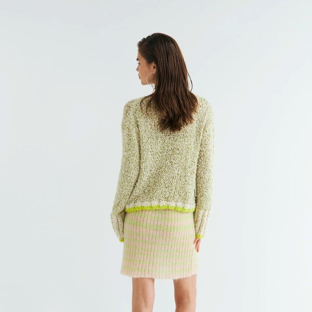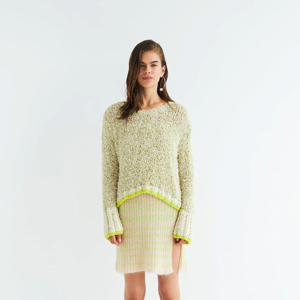 Eloise is a hand-knitted pullover in soft organic cotton blends, featuring an airy open-knit texture and a sporty lime accent at the hem and cuffs. Made by Italian artisans in Tuscany, each piece is unique, reflecting Dawn X Dare’s signature craftsmanship, colour, and individuality.