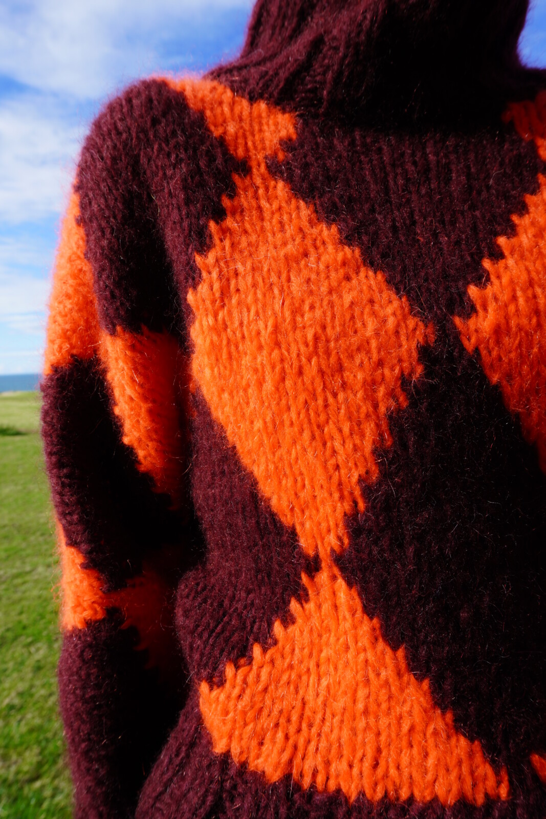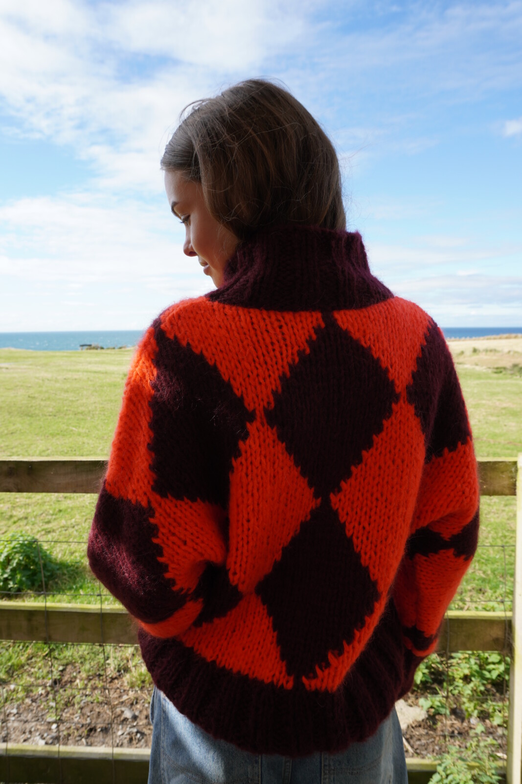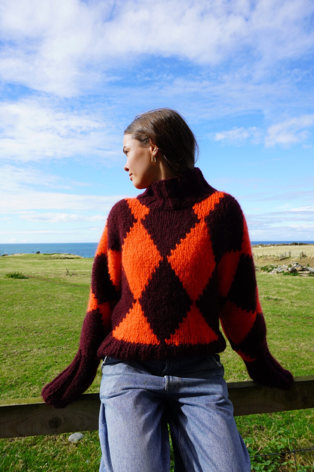 The Erica diamond jumper is a chunky hand-knit sweater featuring a bold diamond pattern in contrasting colours. Slightly cropped with ribbed neck, hem, and cuffs, each piece is crafted by Italian artisans, making every jumper unique in fit and design. A signature of Dawn x Dare craftsmanship and individuality.
