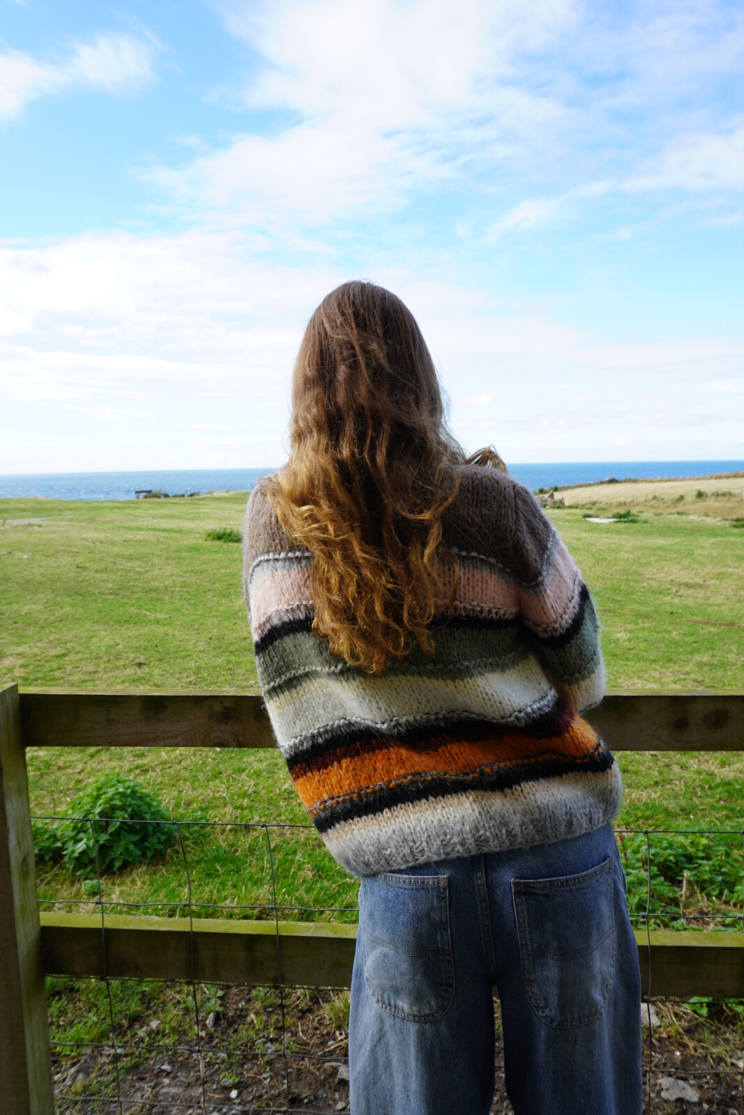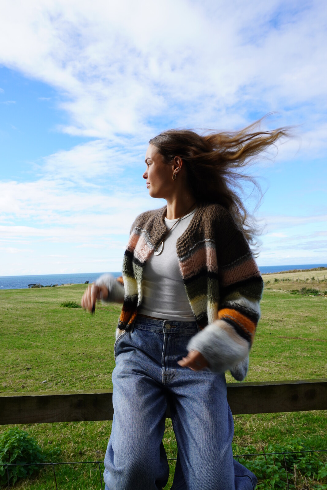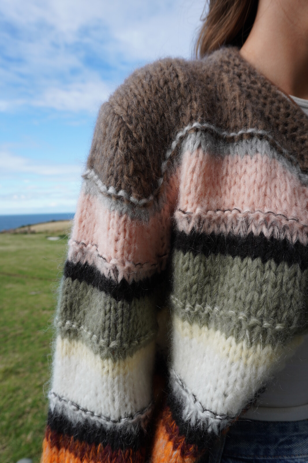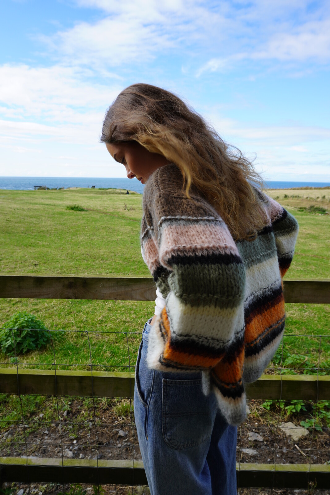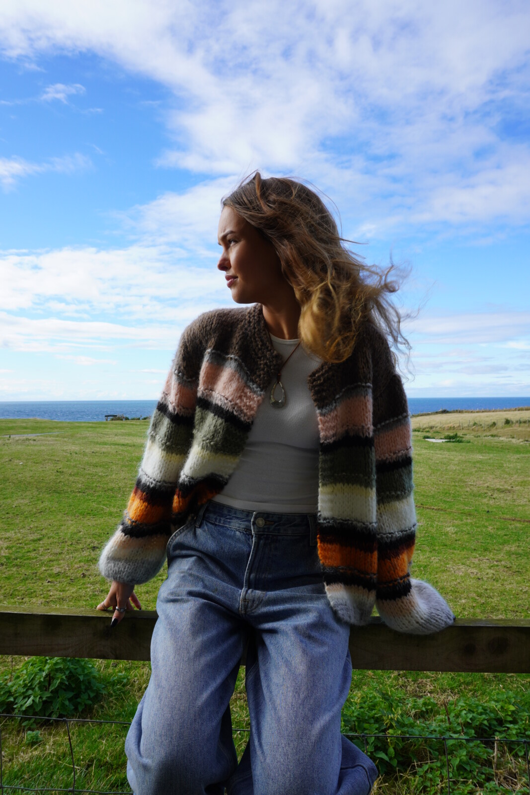 The Gabi Cardigan is a multicoloured mohair knit with bold stripes and a round neckline. Each piece is hand-knit in Italy from leftover yarn, making every cardigan unique in colour and design.
