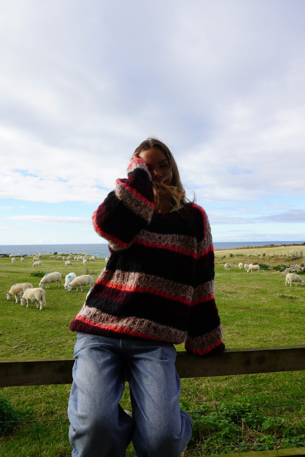 The Savannah jumper is an oversized hand-knit in bold, multicoloured stripes with a sculptural bubble texture and relaxed silhouette. Crafted in soft mohair blend by Italian artisans, each piece is unique and one of a kind.