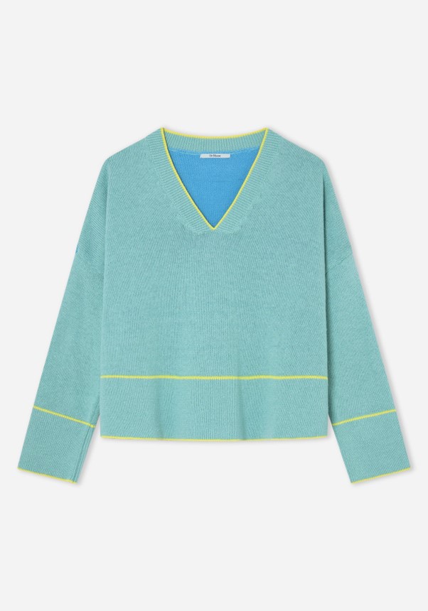 Oversized turquoise blue sweater with a contrasting back. Wide and short cut. Dropped shoulder, long sleeves and V-neckline. Ribbed knit detail and thin contrast-colour stripe on the collar, cuffs and hem. Fluid knit fabric with movement.