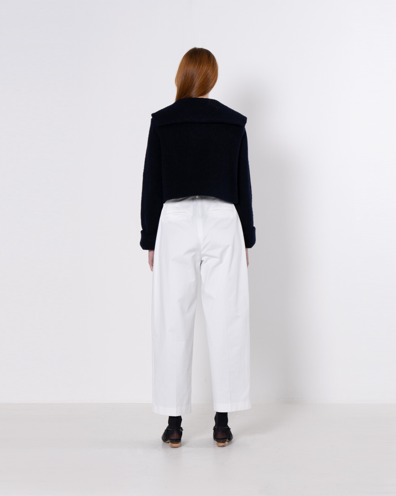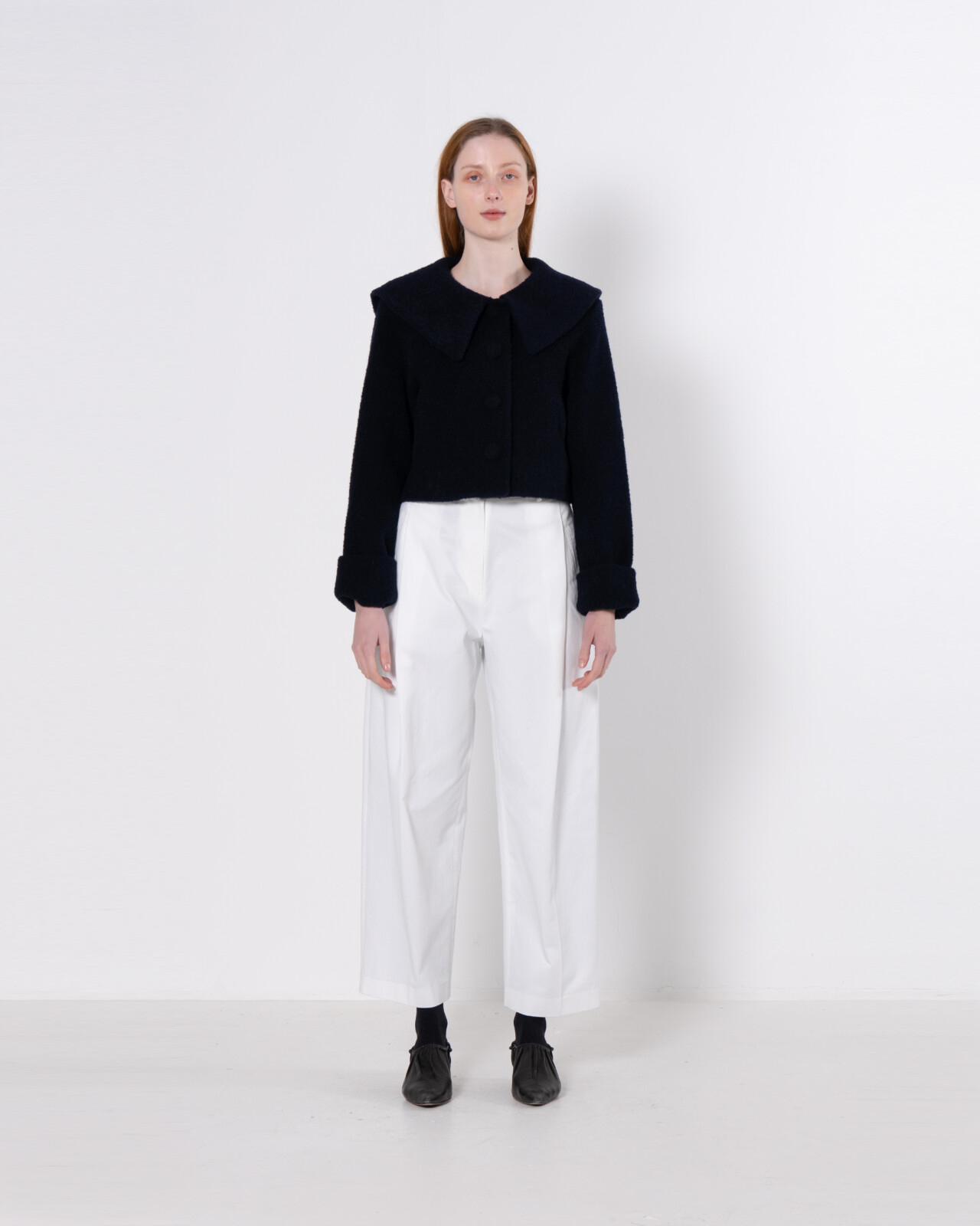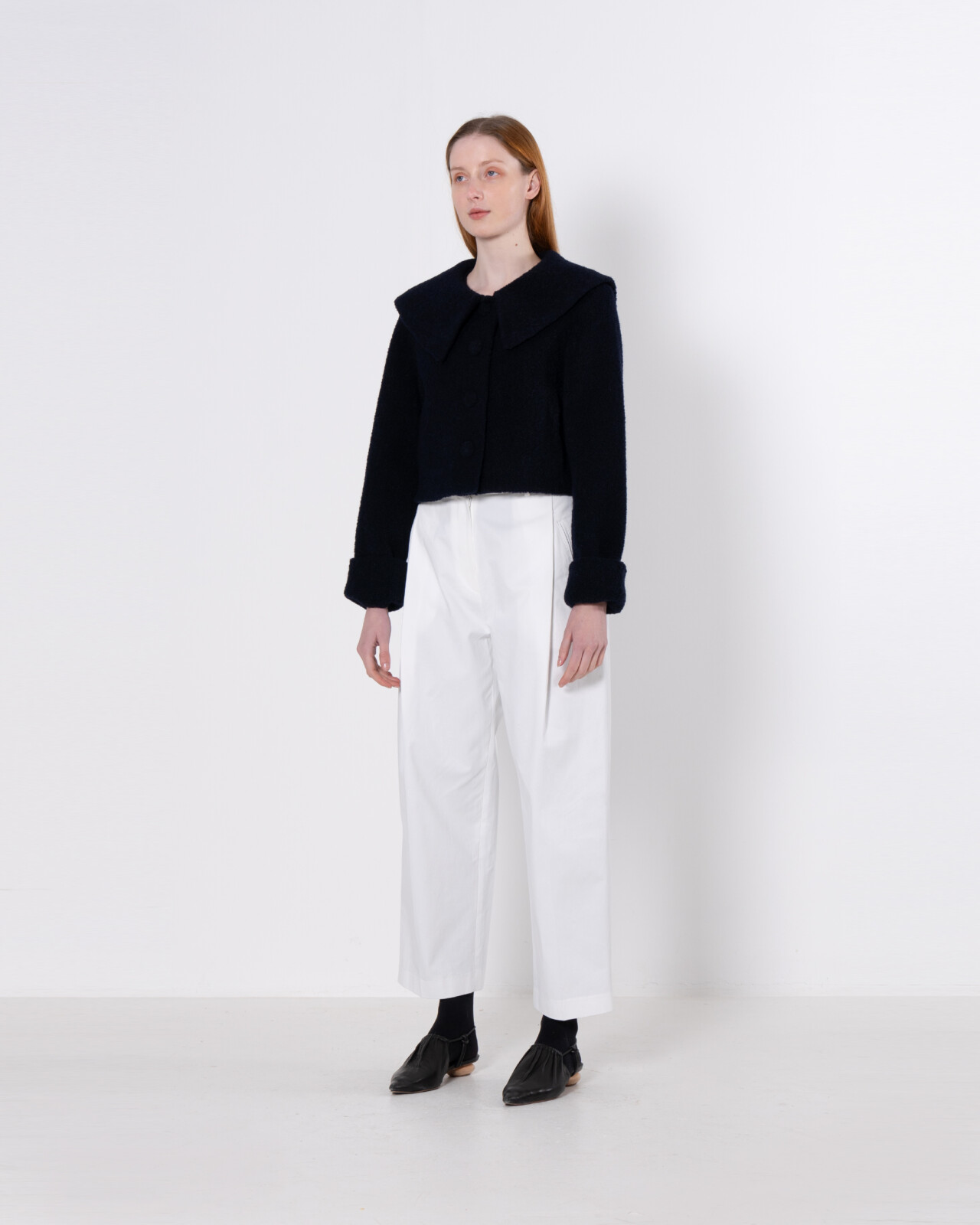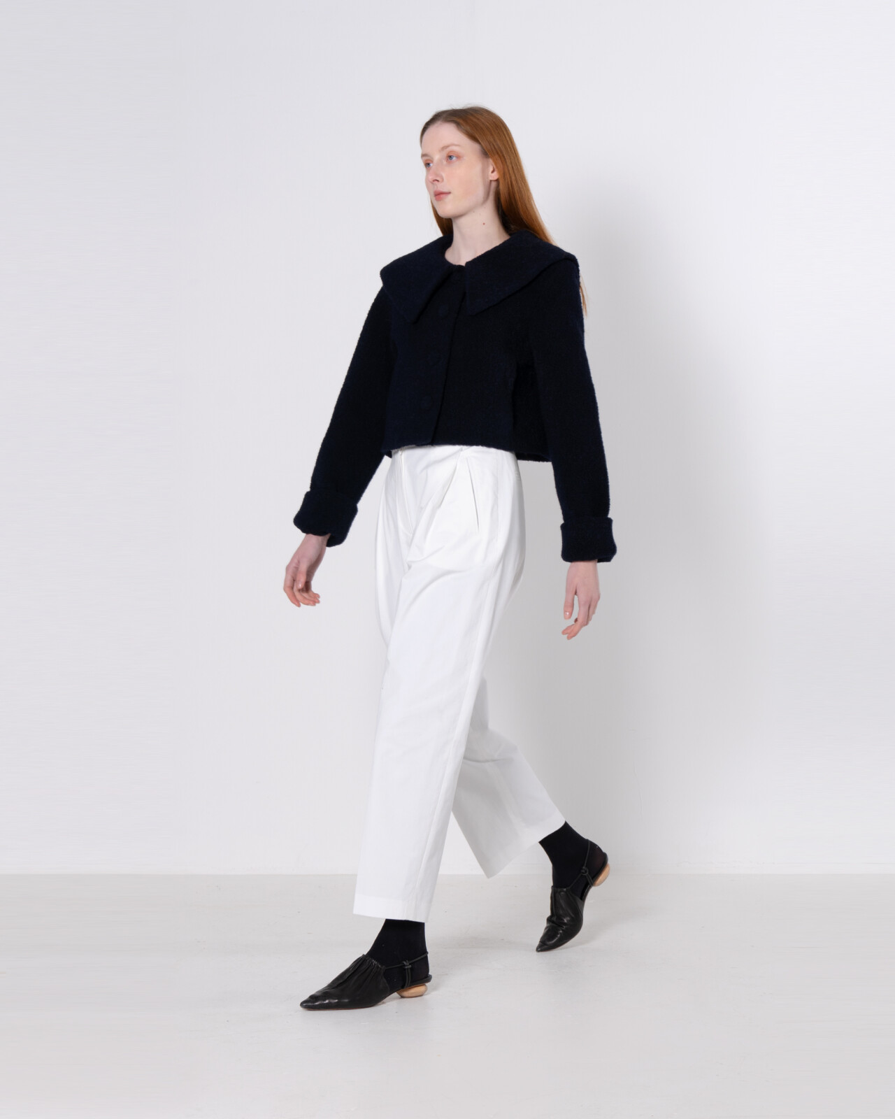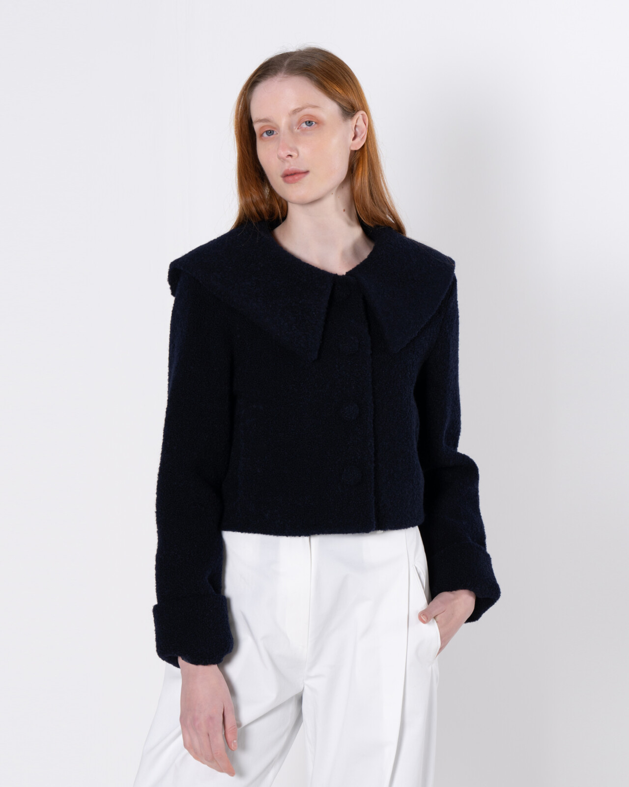 Introducing the navy cropped jacket by designers Emin + Paul. This chic, cropped jacket combines classic tailoring with a modern twist. Featuring a wide, statement collar and tonal button closure, it adds a touch of vintage elegance to any outfit.