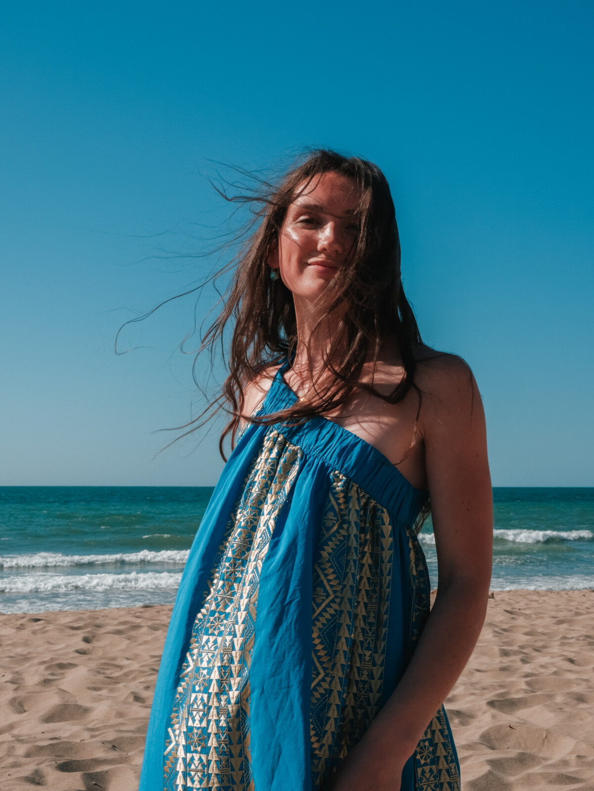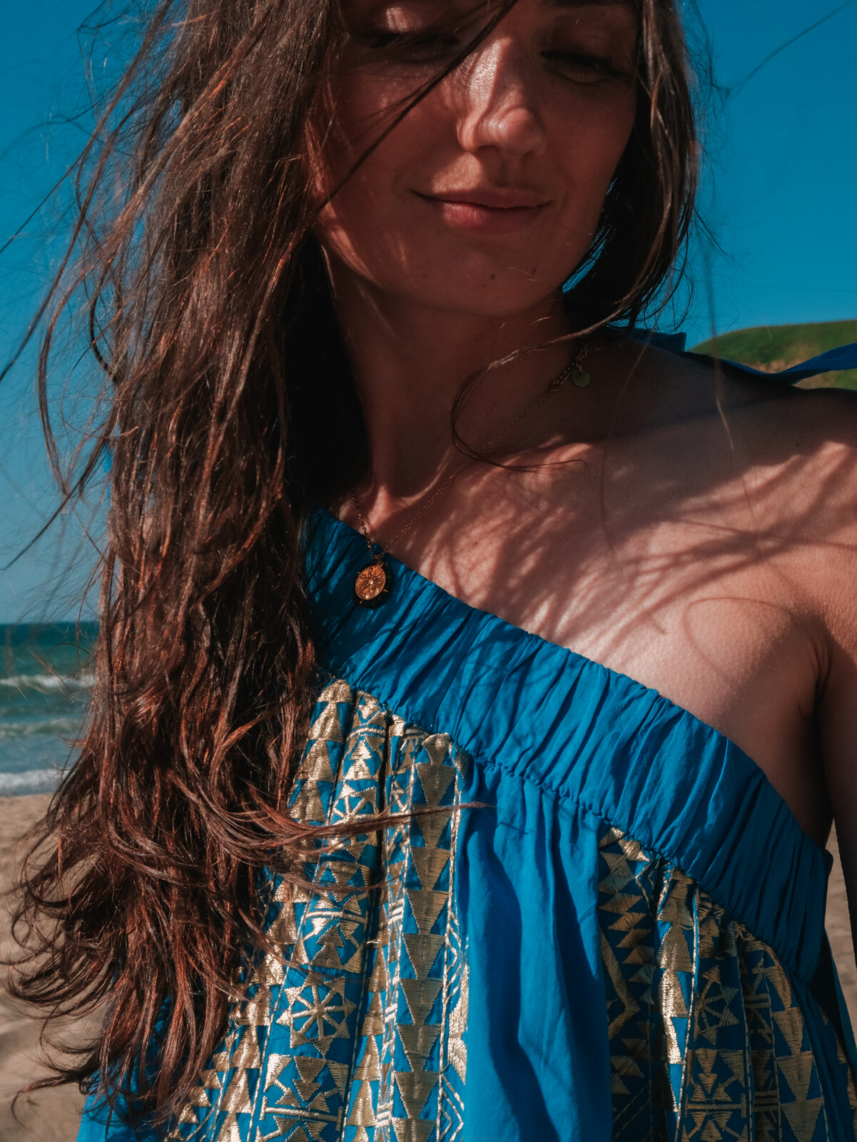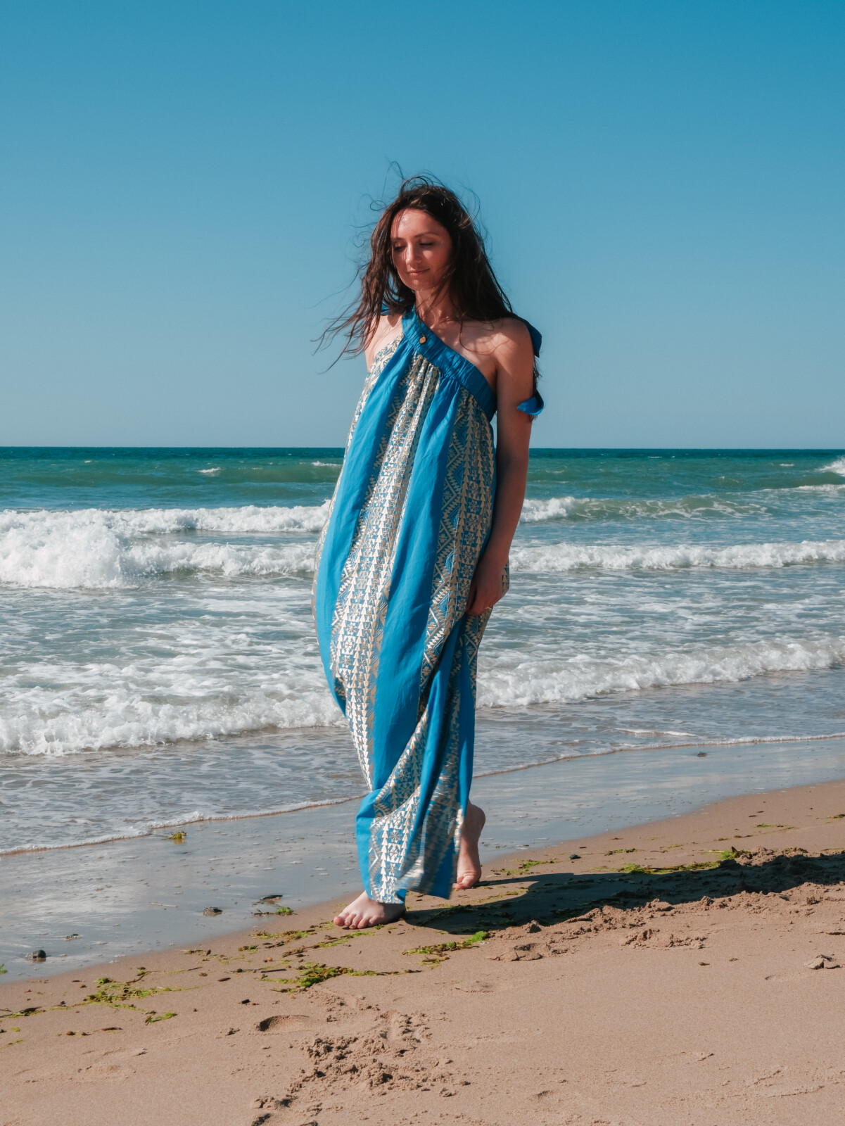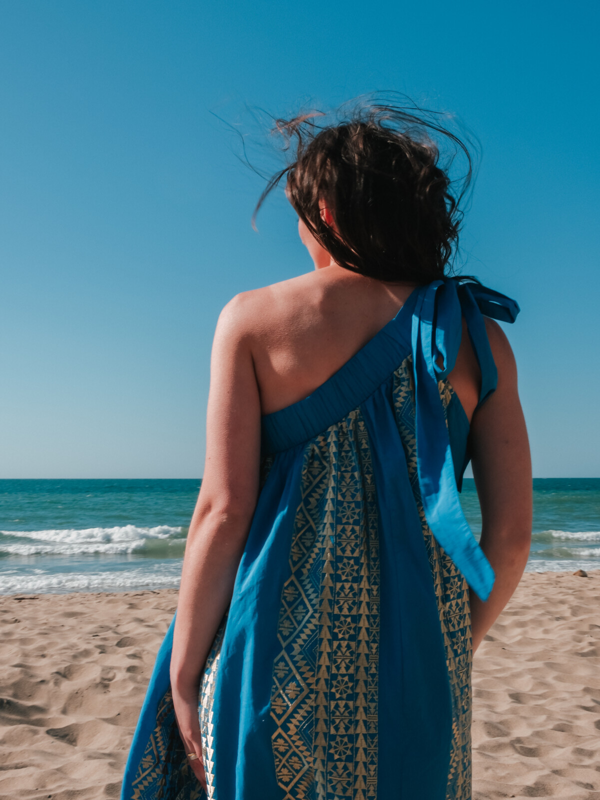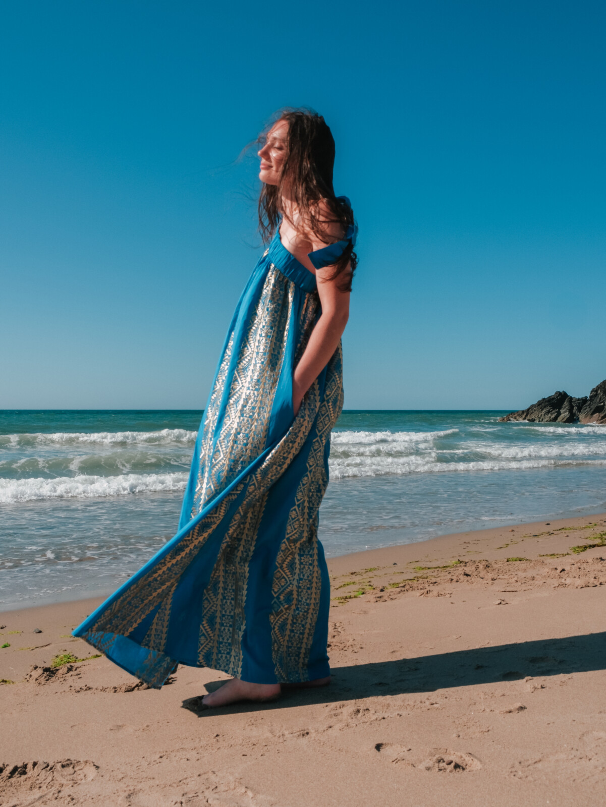 The Greek Archaic Kori blue one-shoulder maxi dress features delicate gold embroidery. Perfect for special occasions or summer soirées.