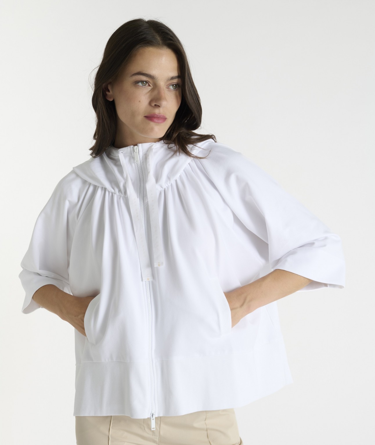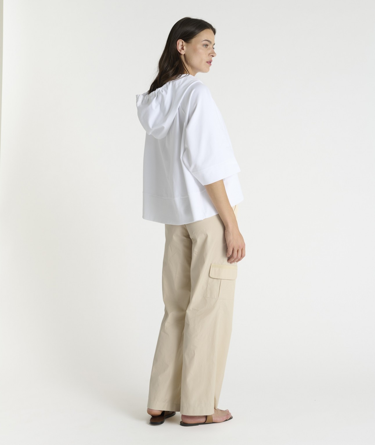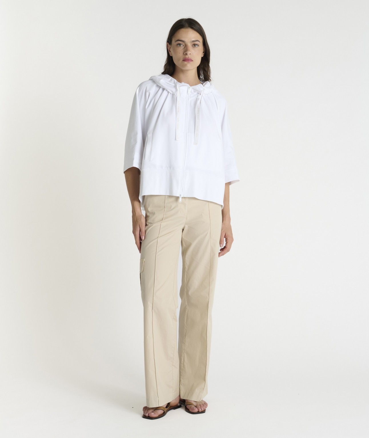 This Hana San cotton sweater blends effortless elegance with everyday comfort. It features a relaxed silhouette with a zip-up front, a gathered neckline, and wide three-quarter sleeves for a modern, airy feel. The hood adds a casual touch, while discreet side pockets enhance practicality.