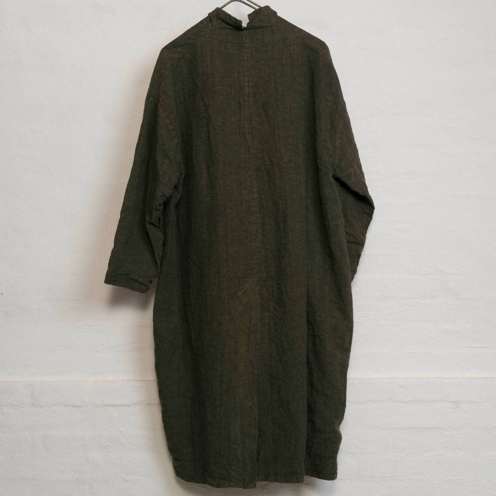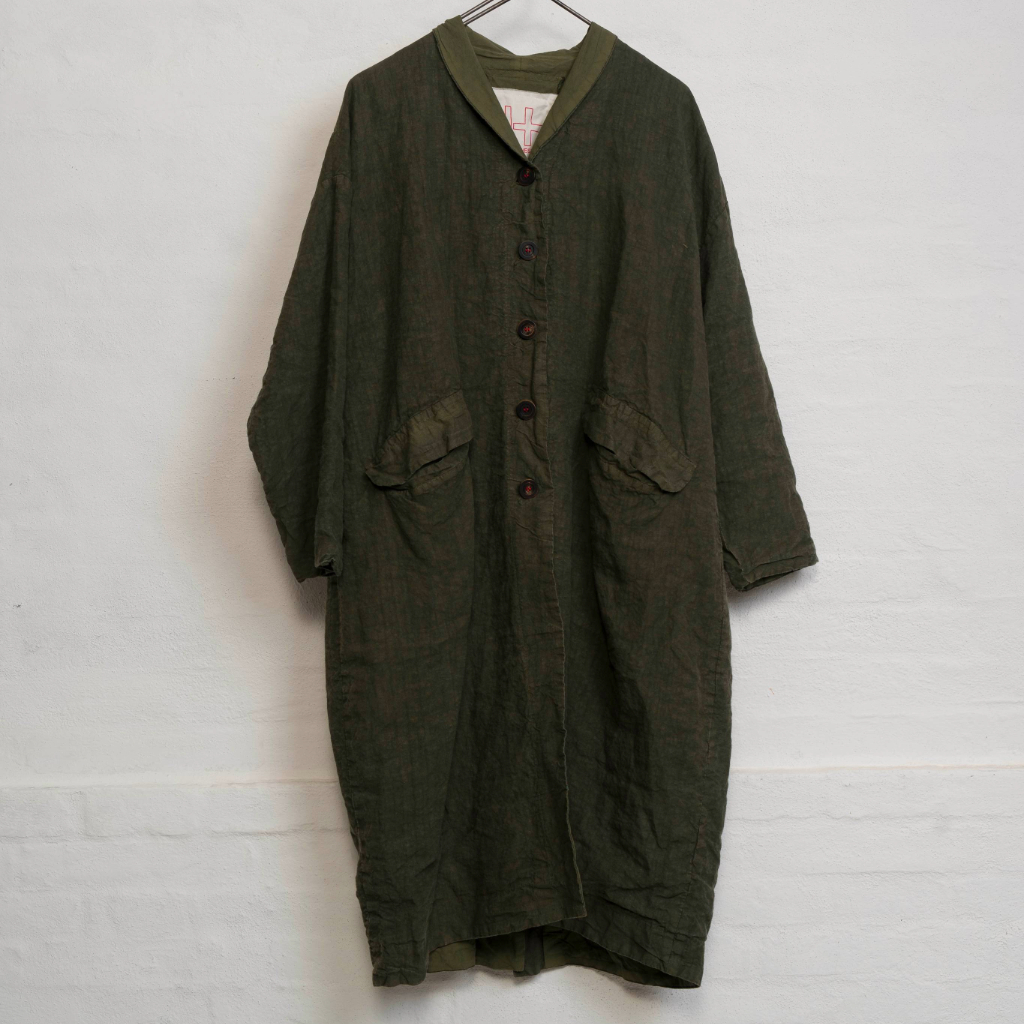 The Hannoh Wessel Corinne coat is made from linen in a military green shade. It features a flattering neckline, two front pockets, and signature red stitching on the buttons — a Cwt Tatws favourite.