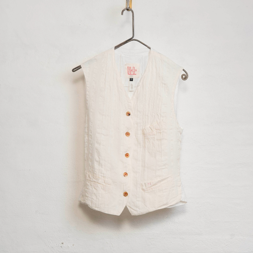 The Hannoh Wessel Gertrud gilet is made from a textured linen–cotton blend. It features two low front pockets, one chest pocket, signature red stitching around the buttons, and an adjustable back for a comfortable fit.