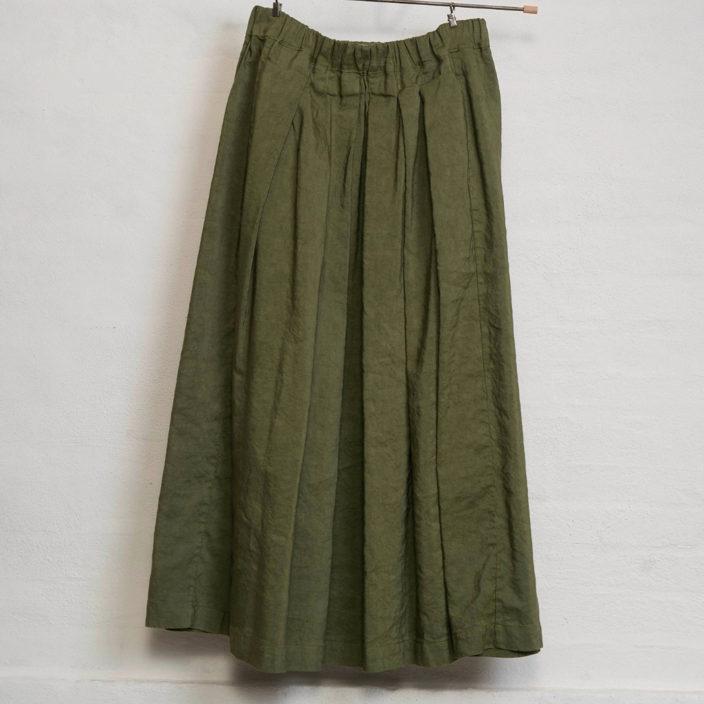 Hannoh Wessel Jette skirt in military green, crafted from a silk–linen blend with an elastic waistband, pleats, and side pockets.
