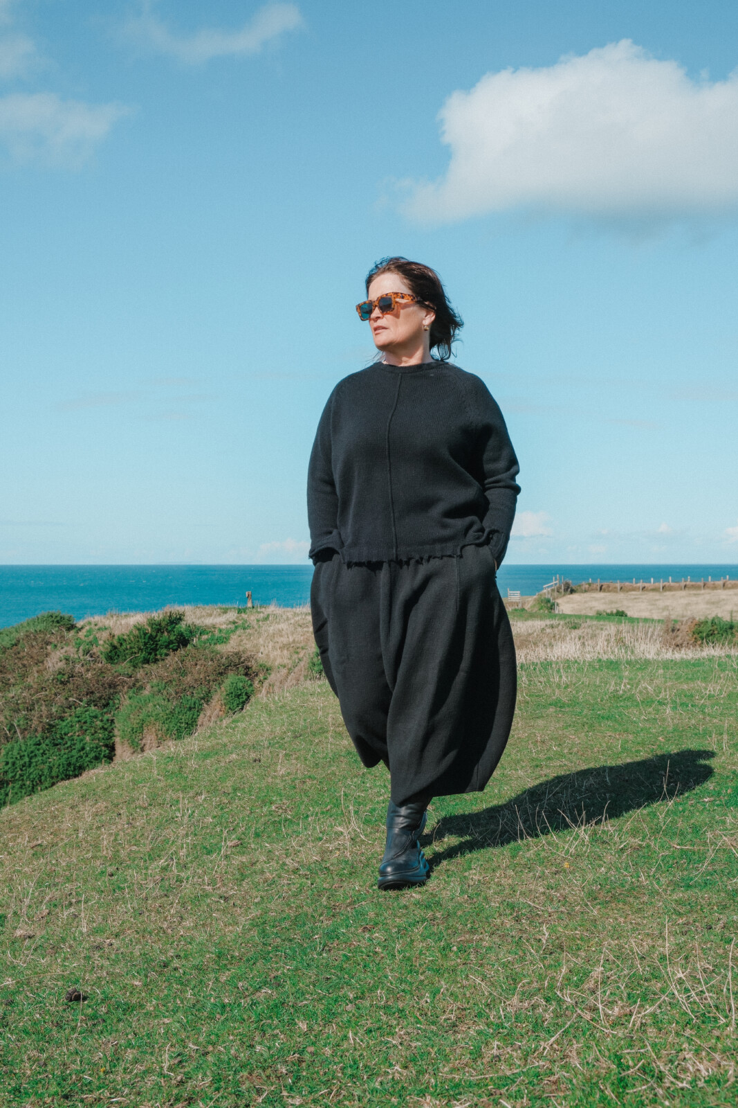 Hannoh Wessel Jordana skirt in black, crafted from a cotton-linen-wool blend with a refined tweed texture. Features subtle balloon shaping, precise seams, side pockets, and an exposed back zip for a tailored yet practical finish.