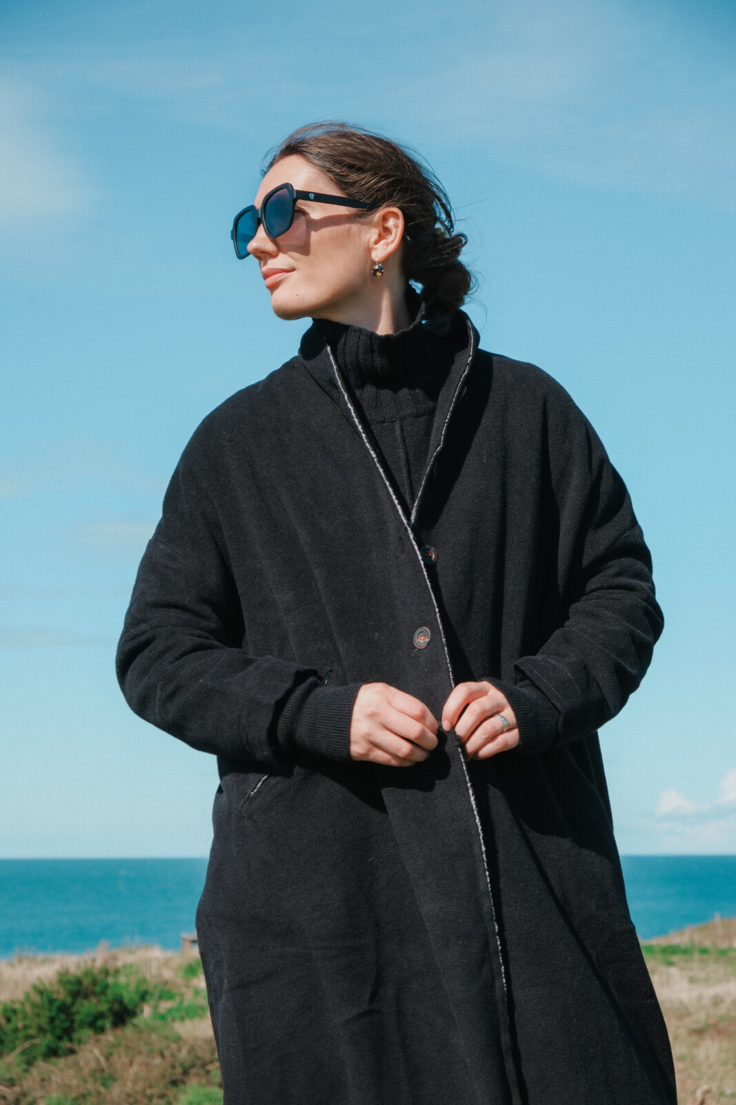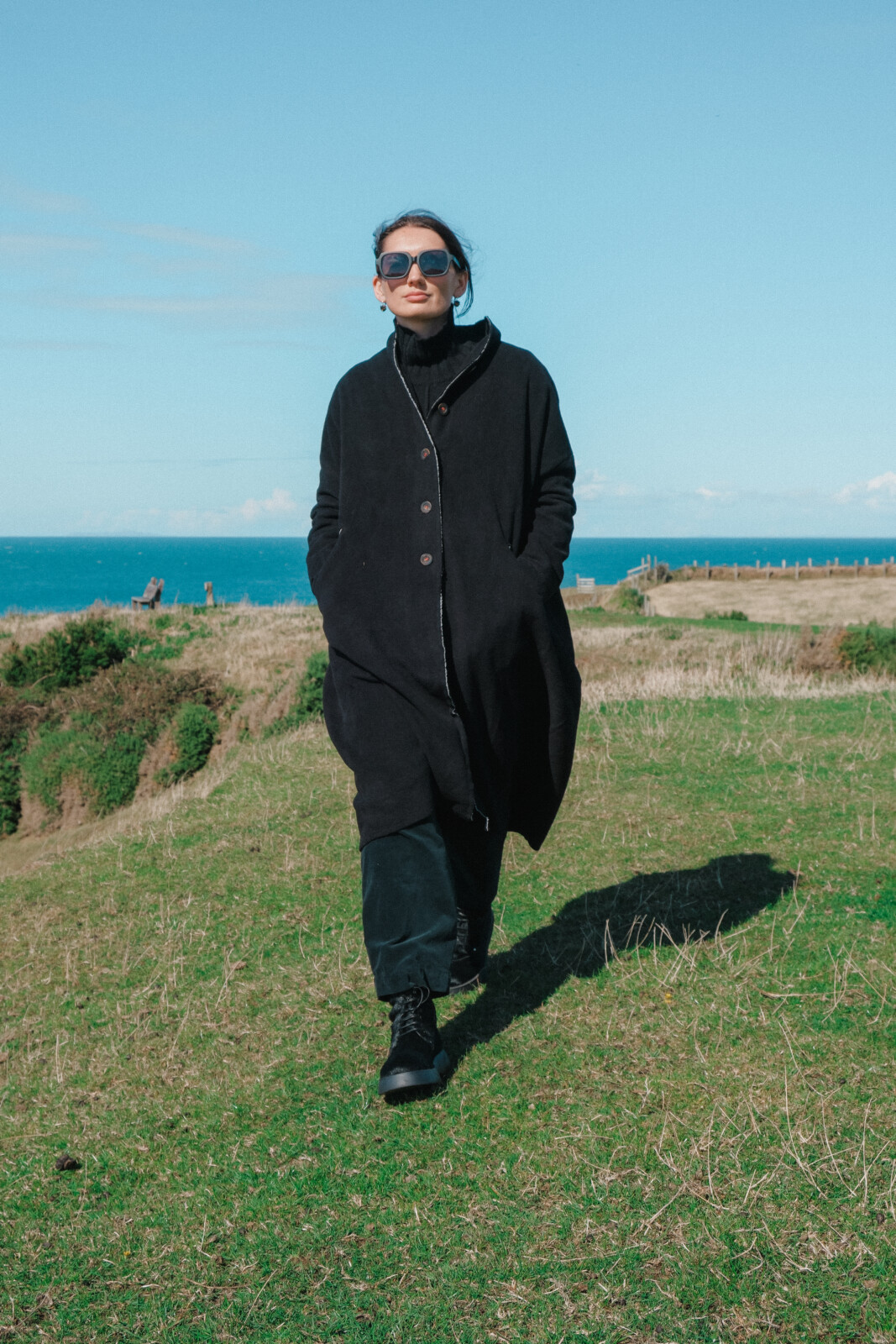 Hannoh Wessel Milena coat in black, crafted from a wool-cashmere blend. Features a wide, dropped-shoulder silhouette, standing collar, button closure with signature red stitching, front patch pockets, knitted cashmere cuffs, raw-edge front, back slit, and full lining.