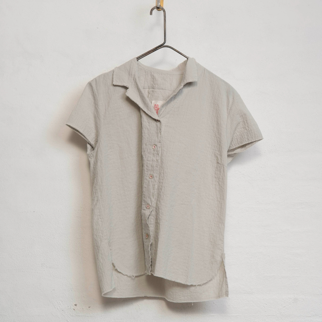 The Hannoh Wessel Sharon shirt features short sleeves and a flattering V-neck collar. Finished with red stitching around the buttons and a frayed hem, it has an easy, relaxed feel.