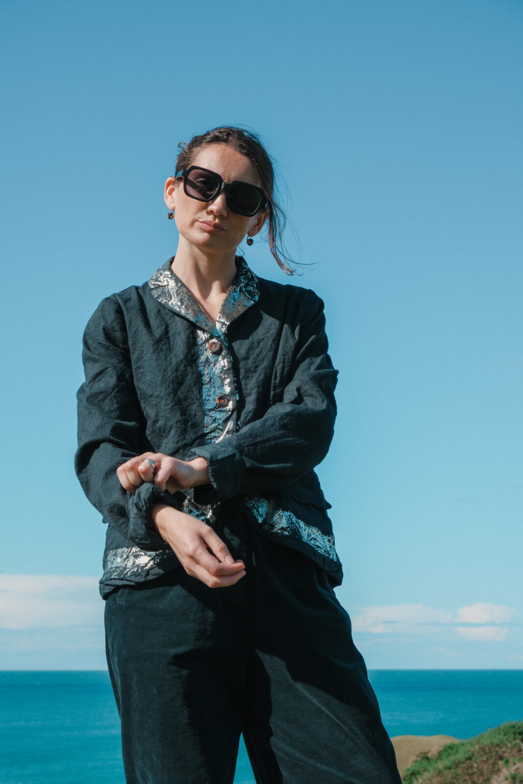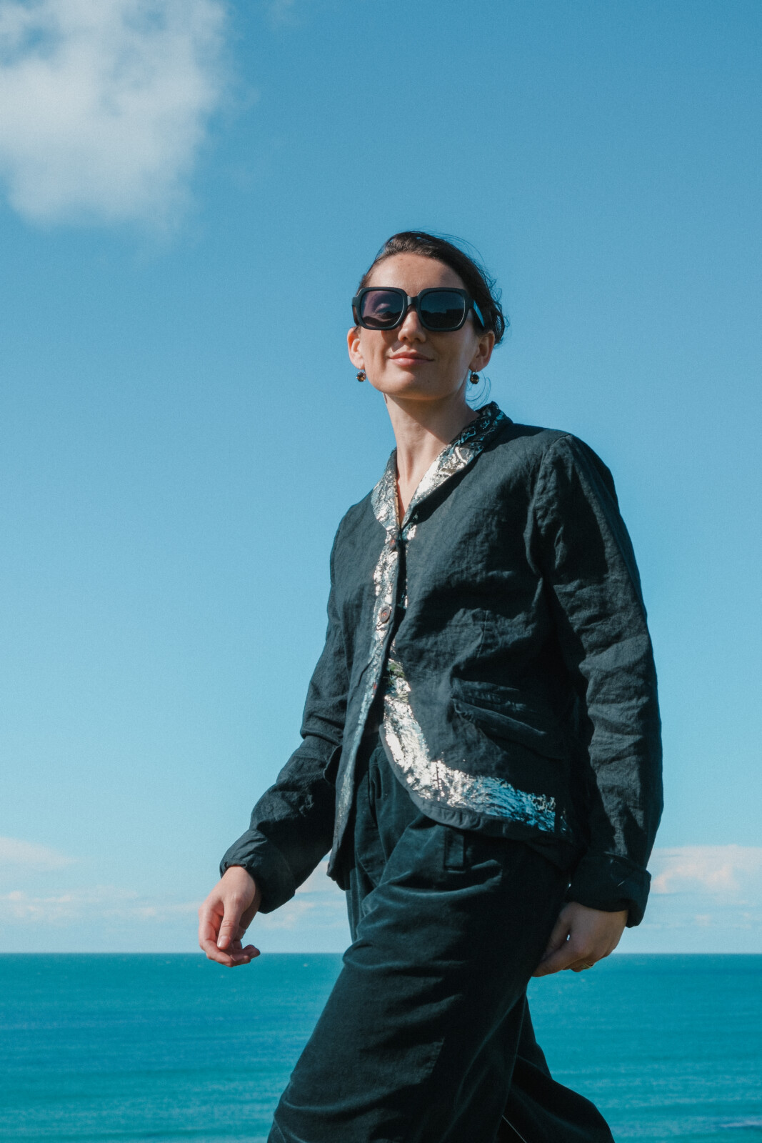 Venus jacket in a cotton-steel blend, featuring a lapel collar, two front pockets, front button closure stitched with red thread, metallic appliqué, and fully lined for structure and style.