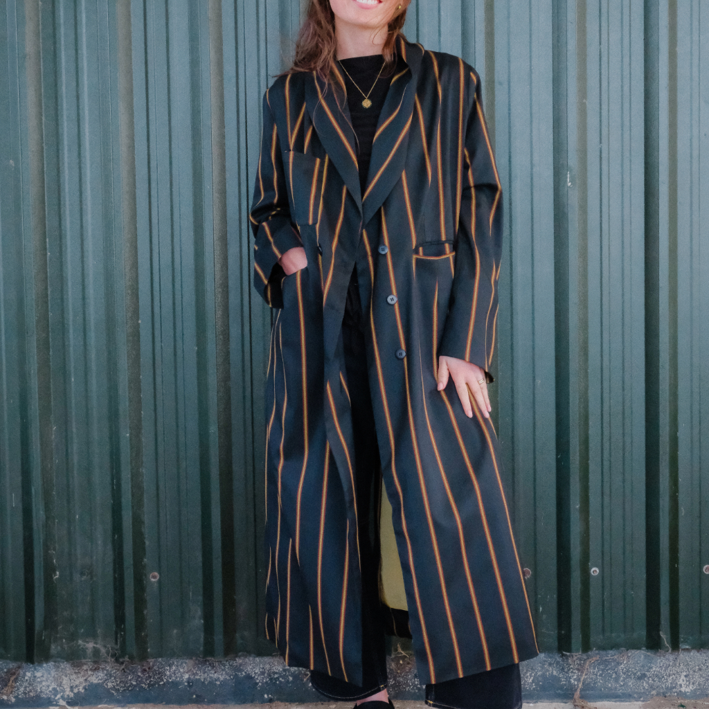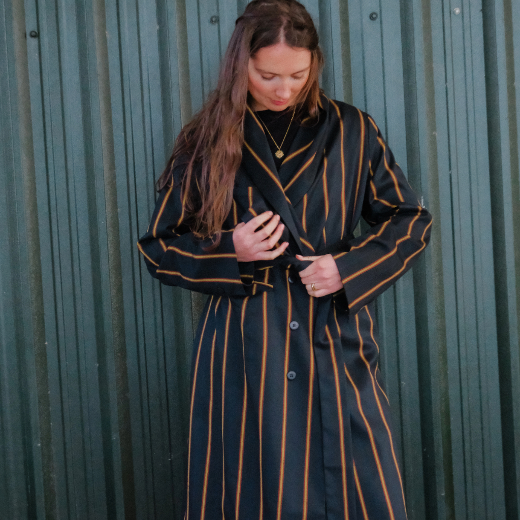 Make a statement in this striking longline coat from Les Filles. Its fluid silhouette is defined by bold vertical stripes and a softly tailored shape, finished with a matching belt for optional cinching. The coat opens to reveal a luxurious gold lining, adding a subtle touch of glamour with every movement. Effortlessly elegant and endlessly versatile, it’s a standout piece that elevates any look.