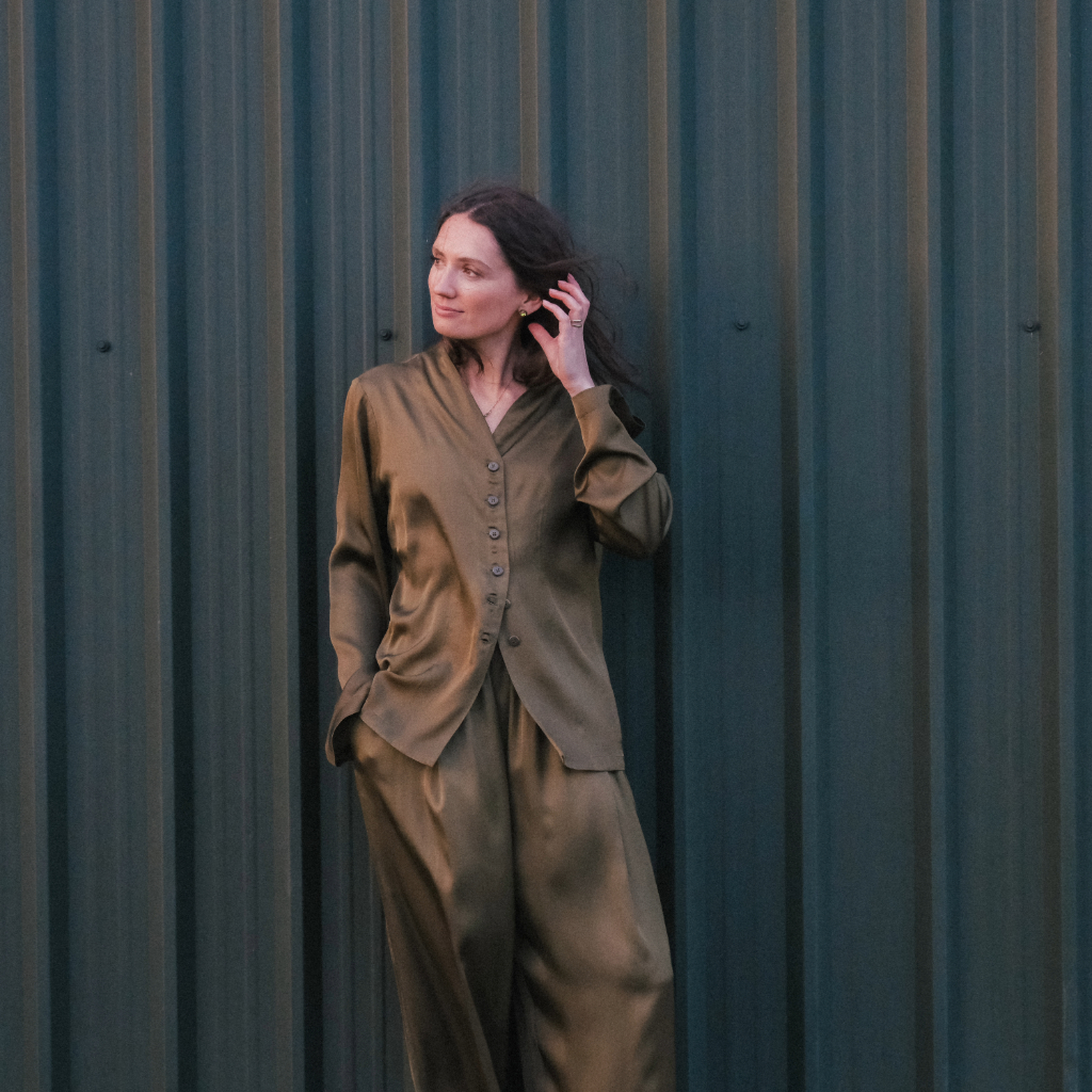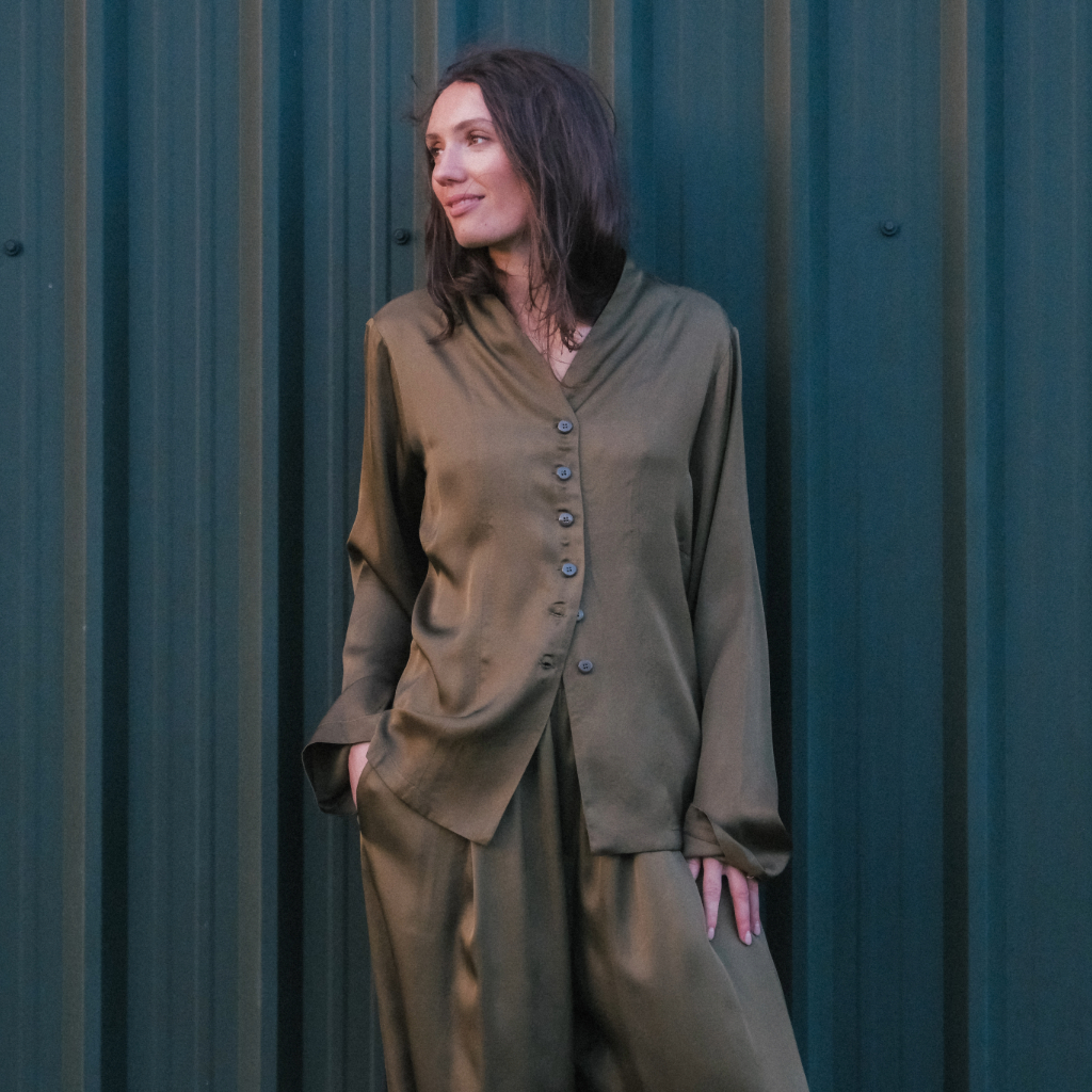 A soft, flowing silk top with a relaxed fit and button front. Elegant, easy, and effortless. Matching trousers available.