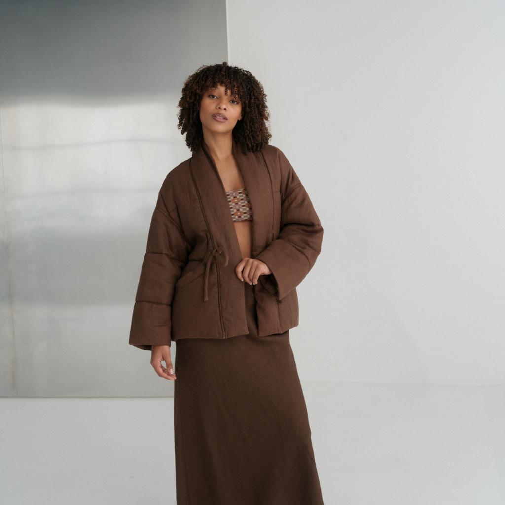 Kimono-style puffer coat with oversized front pockets, chunky tubular front tie, left chest inner pocket, and French seams.