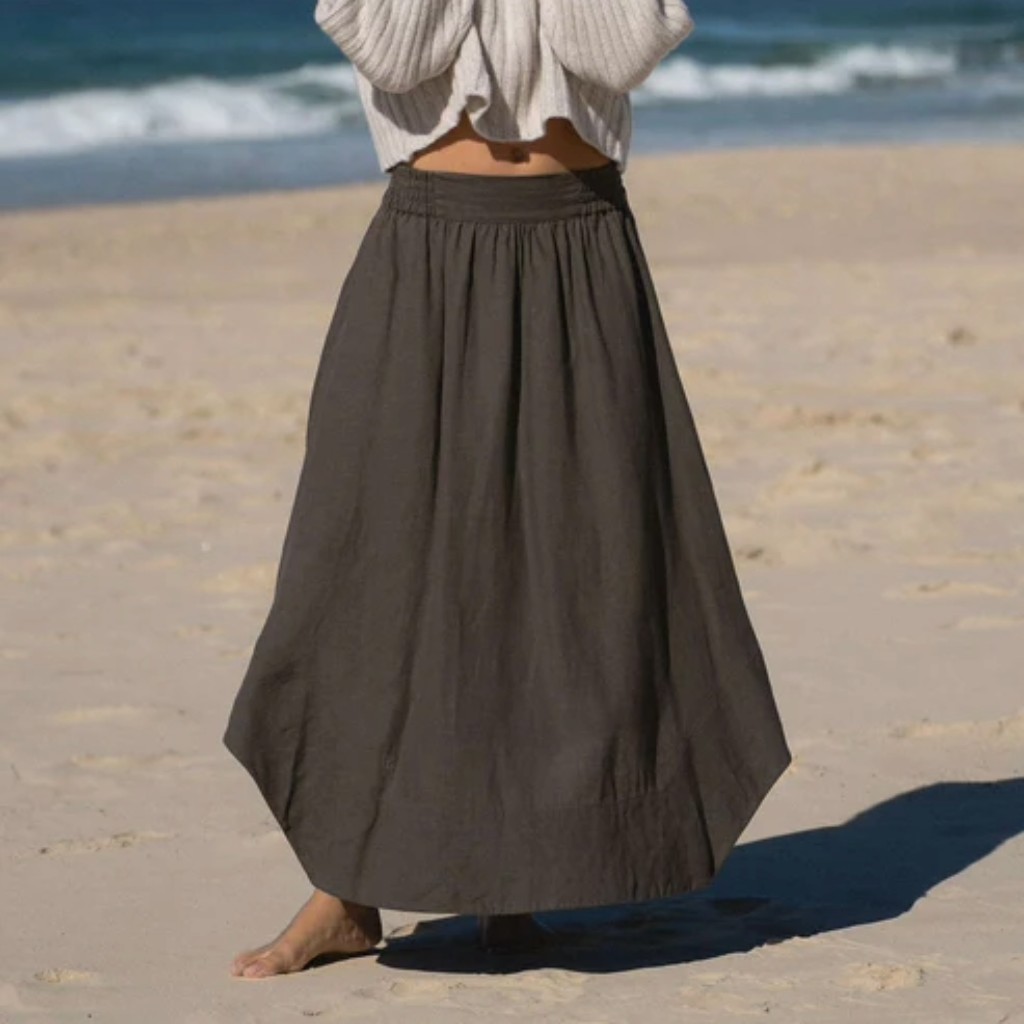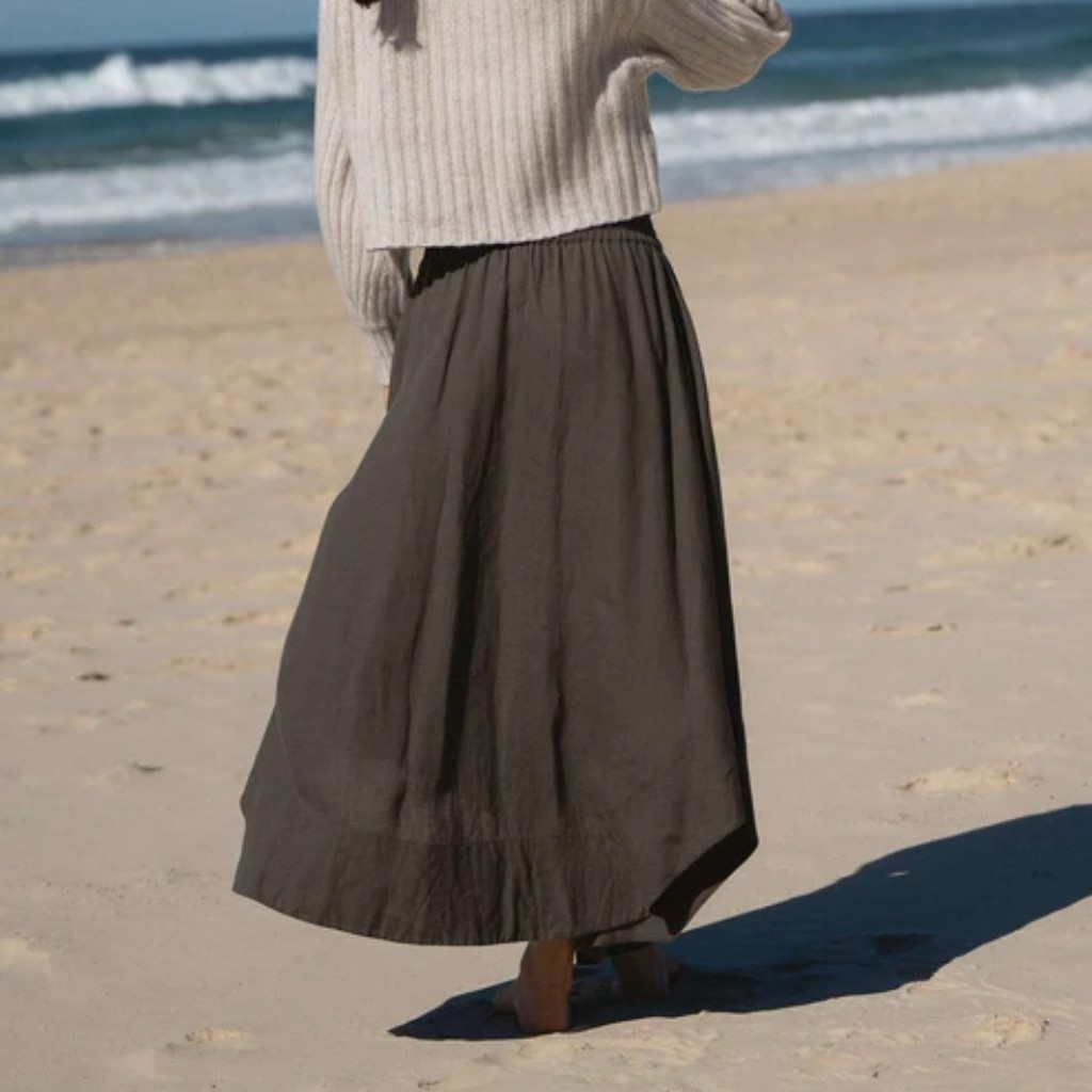 Asymmetrical hi-low skirt with side pockets, elastic waistband, and French seams.