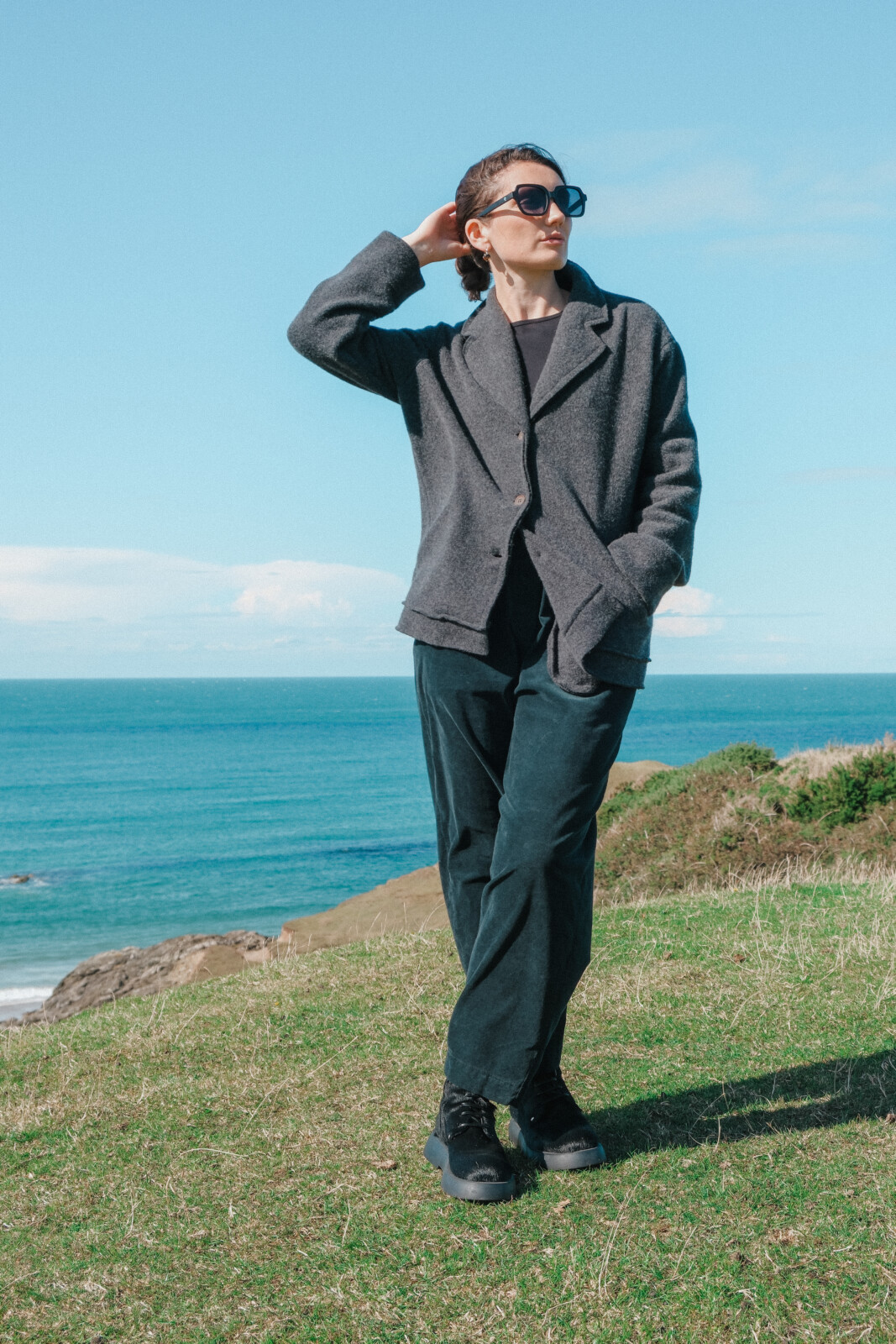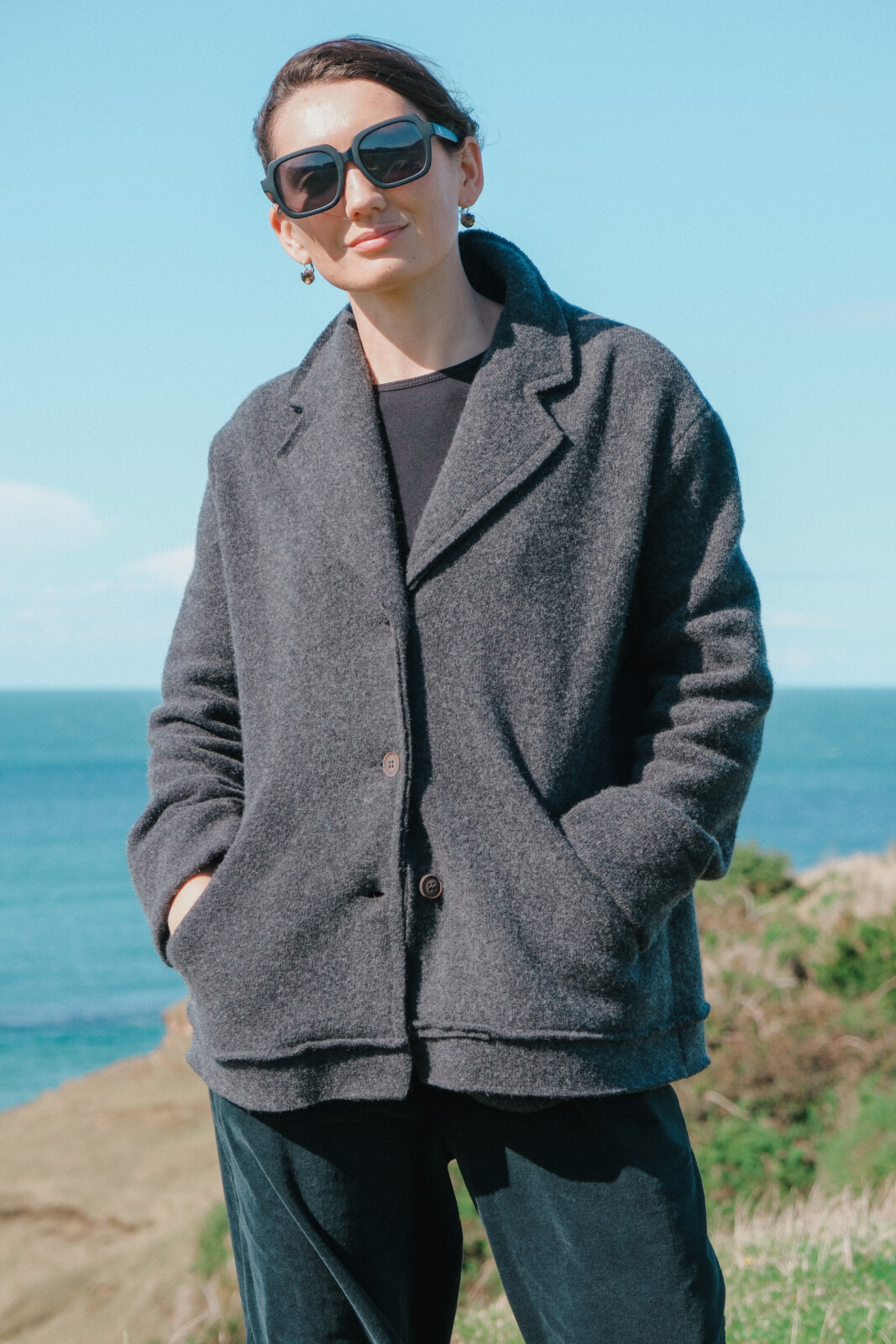 MJ Watson button-front jacket in grey, crafted from a cashmere-wool blend. Designed with a relaxed fit, collar, and front pockets for a soft, timeless layering piece.