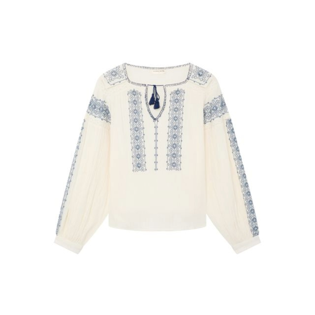 An elegant ivory blouse detailed with blue embroidery and finished with blue tassels. Light, timeless, and easy to wear for everyday style.