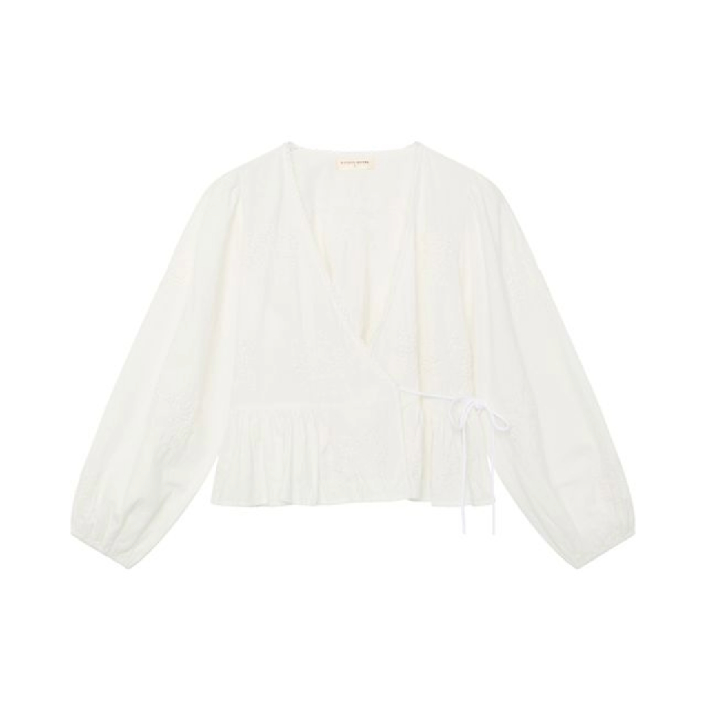 An ivory blouse with subtle embroidery, featuring a crossover front and tie closure. Elegant, lightweight, and perfect for a refined, effortless look.
