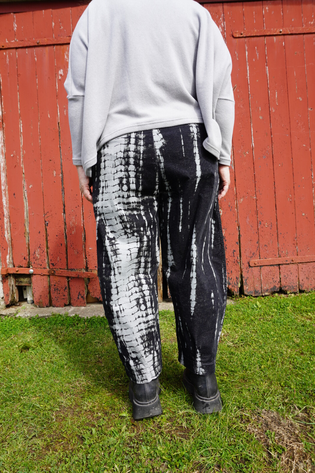 Mama B Bianco trousers in a velvet-like tie-dye print, with a tapered balloon shape, elasticated waist, and side pockets.