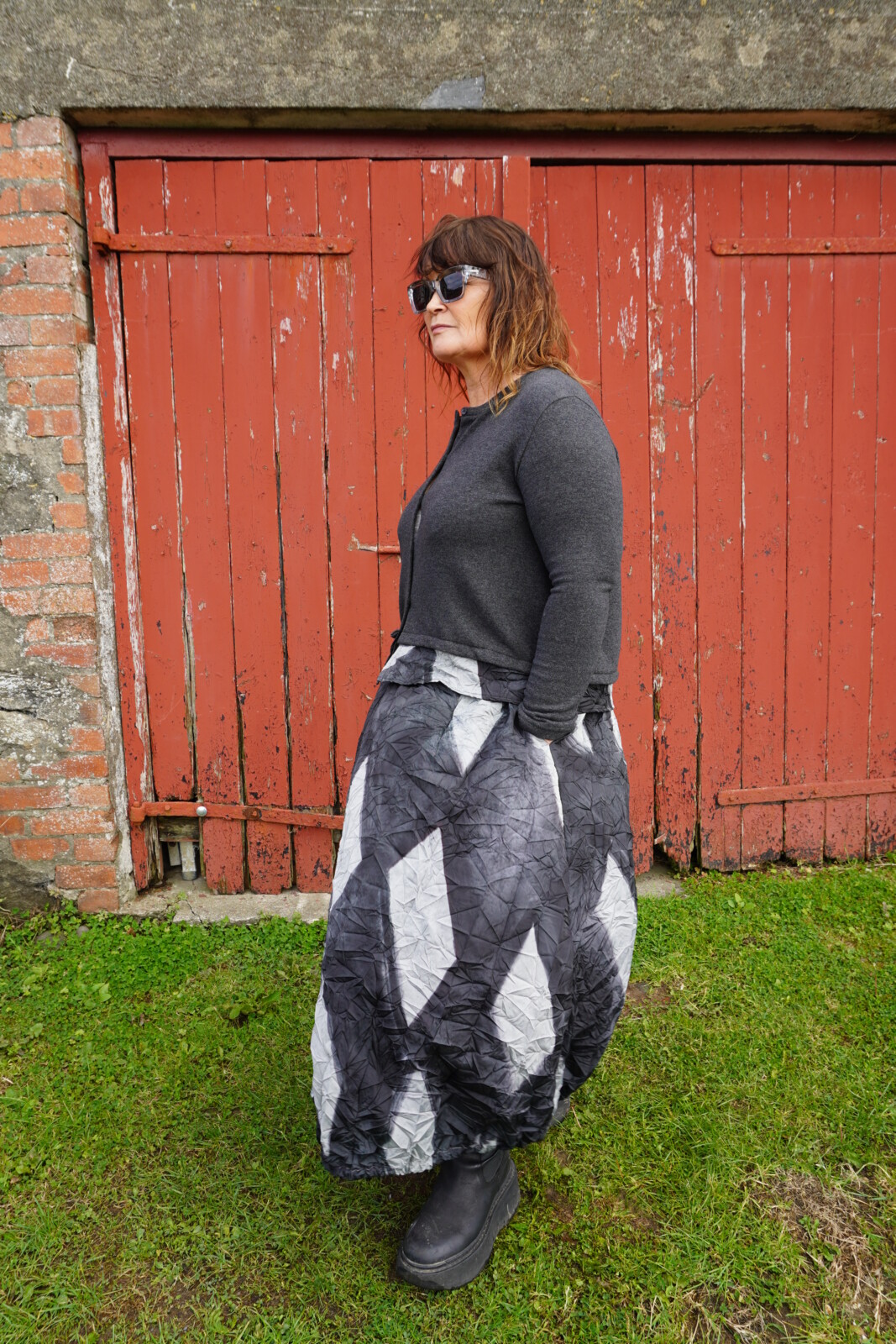 Mama B lightweight crinkle skirt with an elasticated waist, side pockets, and adjustable drawstring hem.