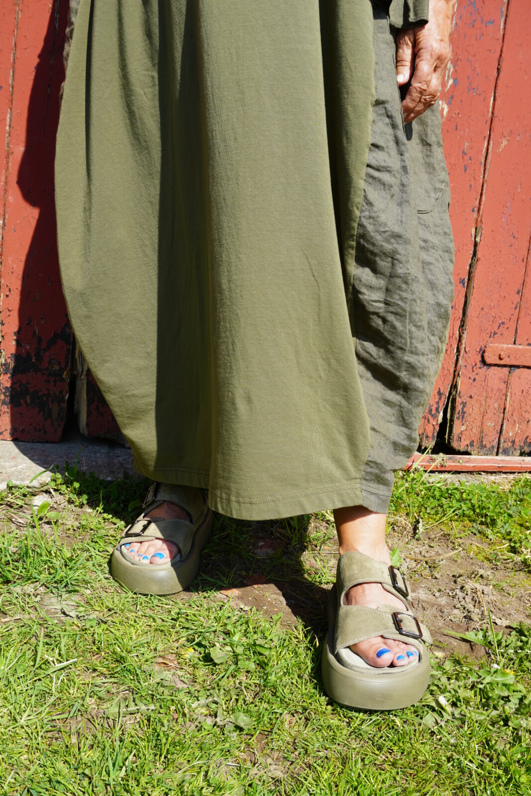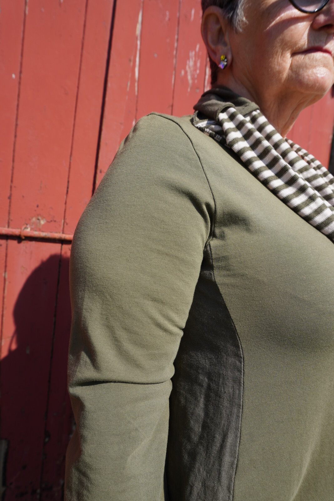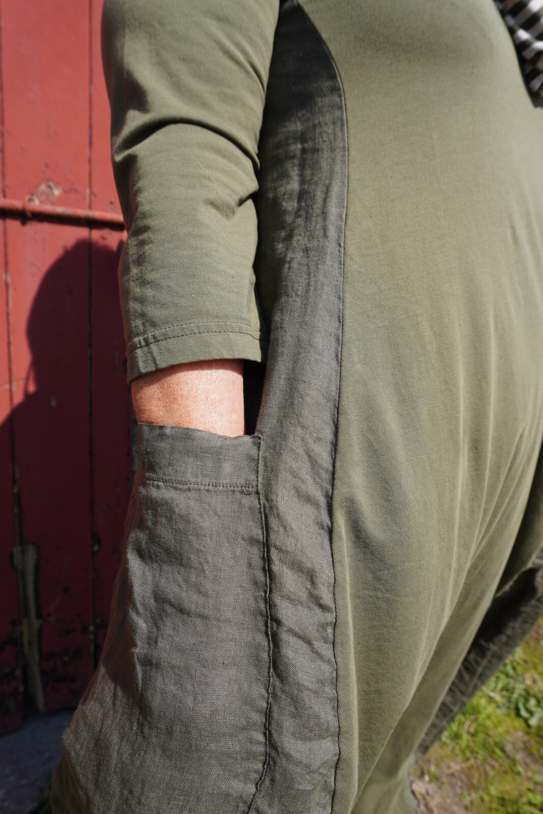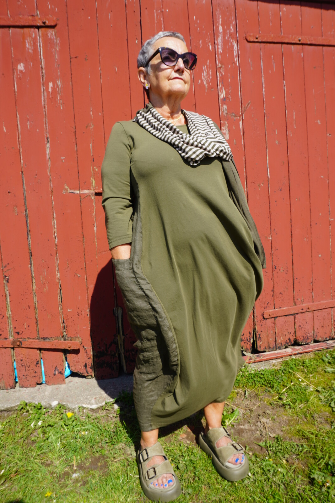The Mama B Soffice dress combines comfort and style with its relaxed fit, 3/4 sleeves, round neck, side patch pockets, and woven linen inserts for added texture and ease.