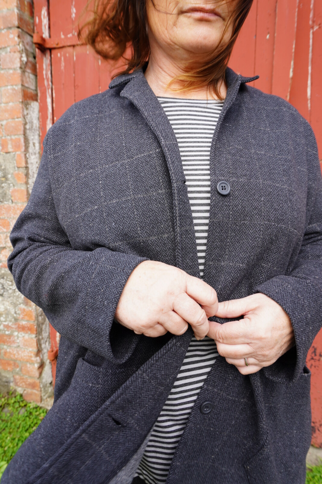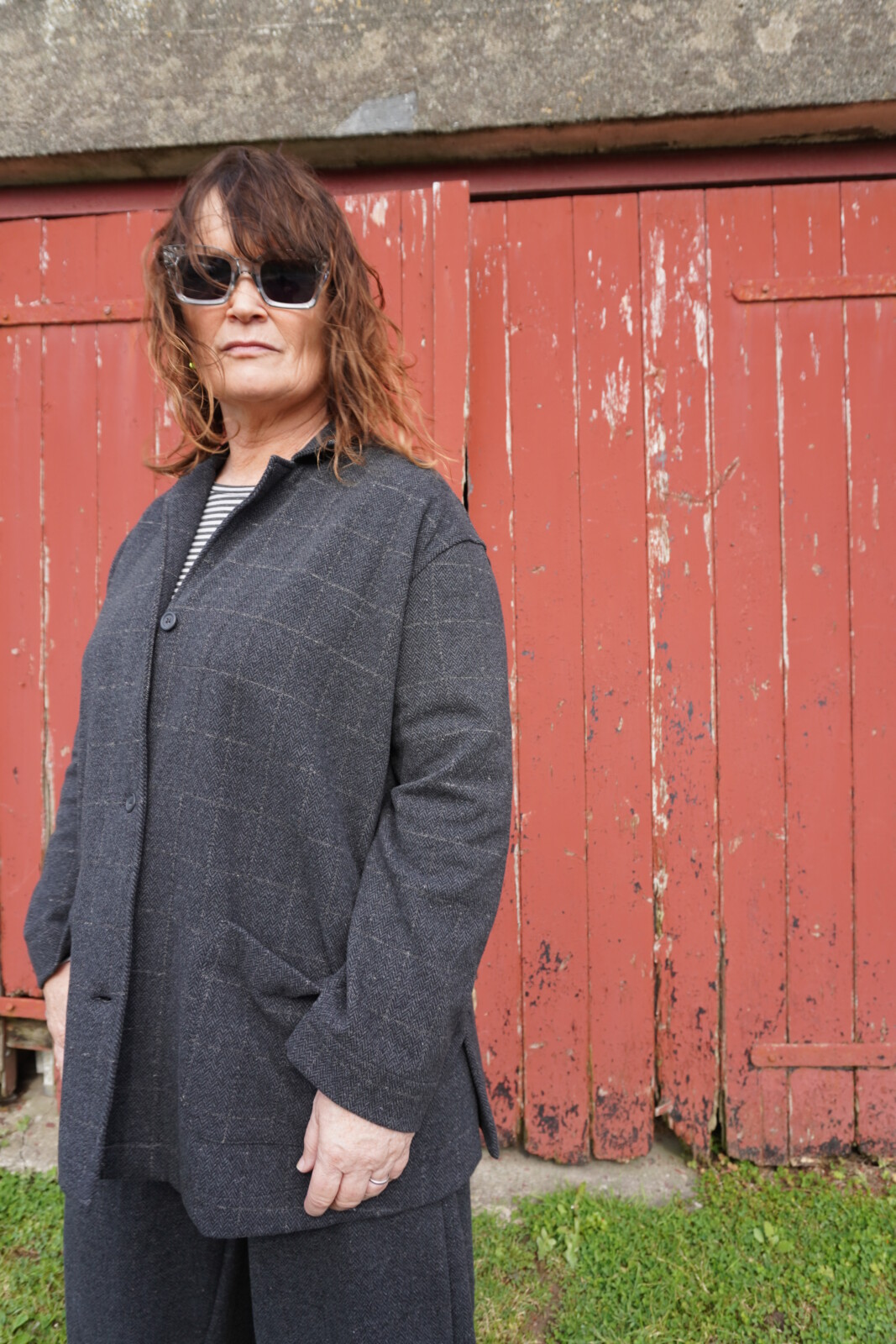 Mama B Cereale jacket in grey check, with long sleeves, front buttons, and pockets for a relaxed, stylish look.