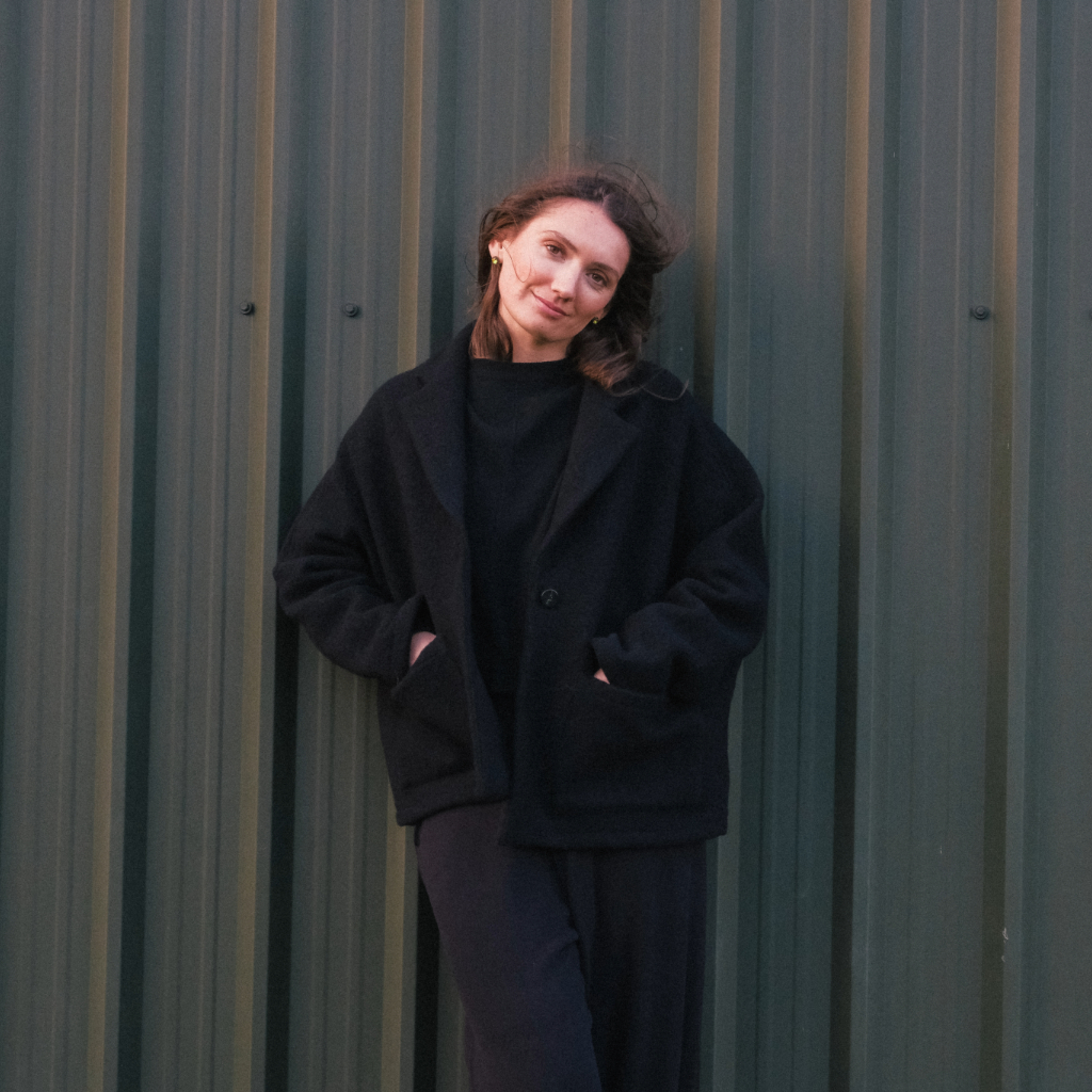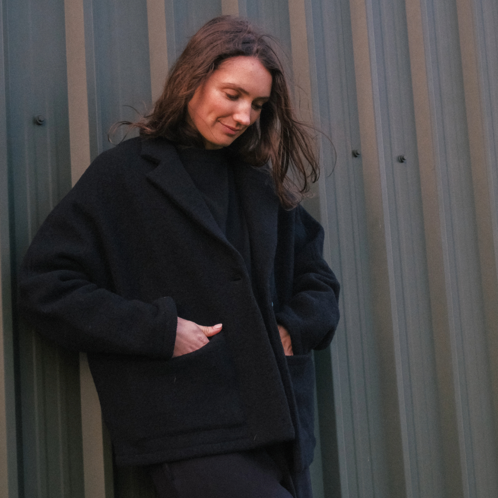 A warm, boxy wool jacket with a single-button front and deep pockets. Soft, relaxed, and easy to layer for everyday wear.