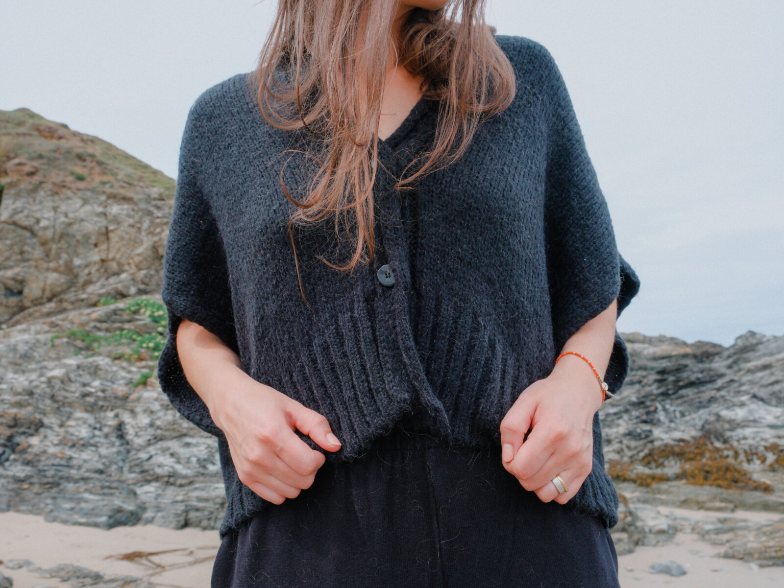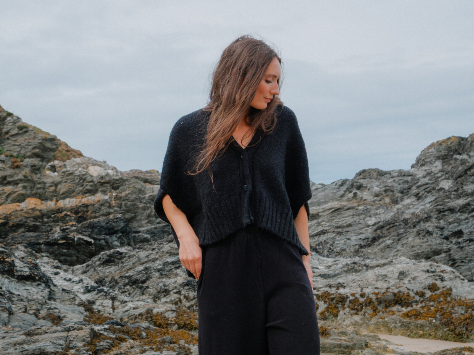 This Neirami black buttoned poncho is the perfect layering piece for cooler days. Made from a soft, textured knit, it features a relaxed shape with a subtle V-front hem and button closure.
